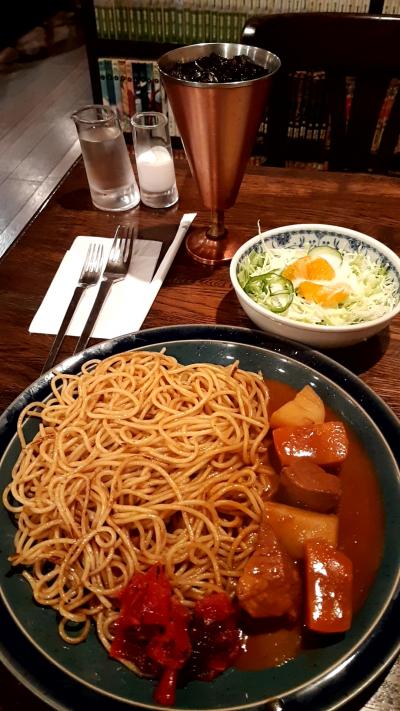 スパゲティにカレーがかかってるだけと言ってしまえば、それで終わりですが、カレーの具がゴロゴロとしてとても美味しかった。
