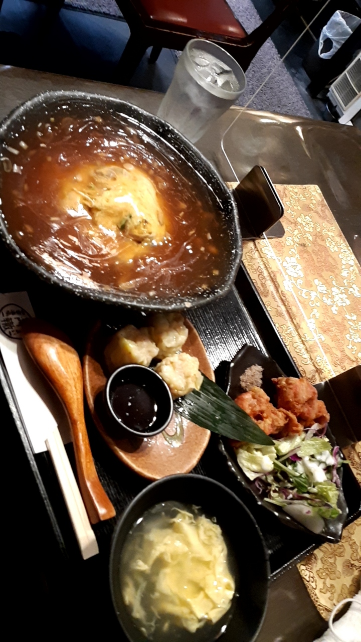 昼食メニューは沢山ありますが、ここはやはり「しゅうまい定食」。見た目では、たっぷりあんかけの大きな天津飯が主役なんですが、、、お店のおススメ「しゅうまい」が主役です。