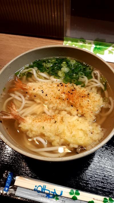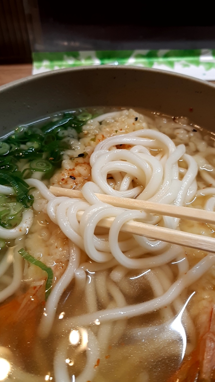 大きなエビ天が2つ。うどんは細うどんで、少しコシがあって、とても美味しかった。