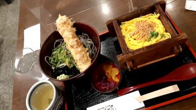 ミニ鮭そぼろセイロは、案外量も多くて、とても美味しい。そばは、大きなちくわ天が入ってます。冷たいそばでも温かいそばでも選べます。今回は外が暑かったので、冷たいそばがとても美味しかった。