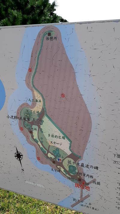なお、島には、浮桟橋や海浜整備され、宮本武蔵・佐々木小次郎両雄の像、関門海峡沿いには散策道や休憩所も整備されているが、島の1/3のエリアだけです。その他2/3は私有地のようで、何も整備されておらず、島を一周することはできなかった。