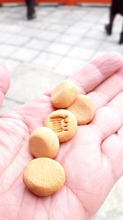 窪みに入った運玉は定期的に回収されて「幸の玉御守」として袋に納められ一個300円で販売されてます。関西人よりも商売上手です、、、、- 旅行時期