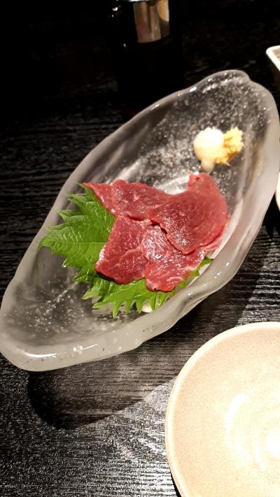 夜定食のメニューもそこそこ種類があり、サイコロステーキ定食を注文。さらに赤のグラスワインを追加。ホテル提携クーポンで、馬刺しがサービスとして提供された。