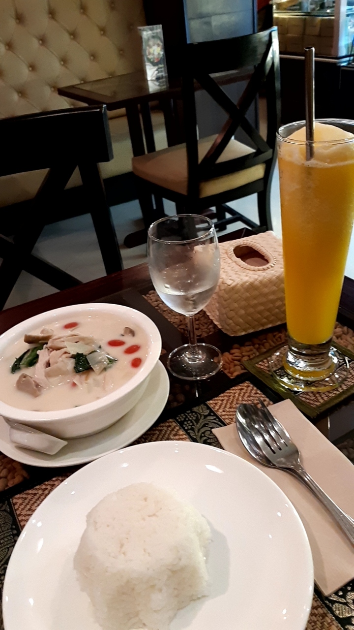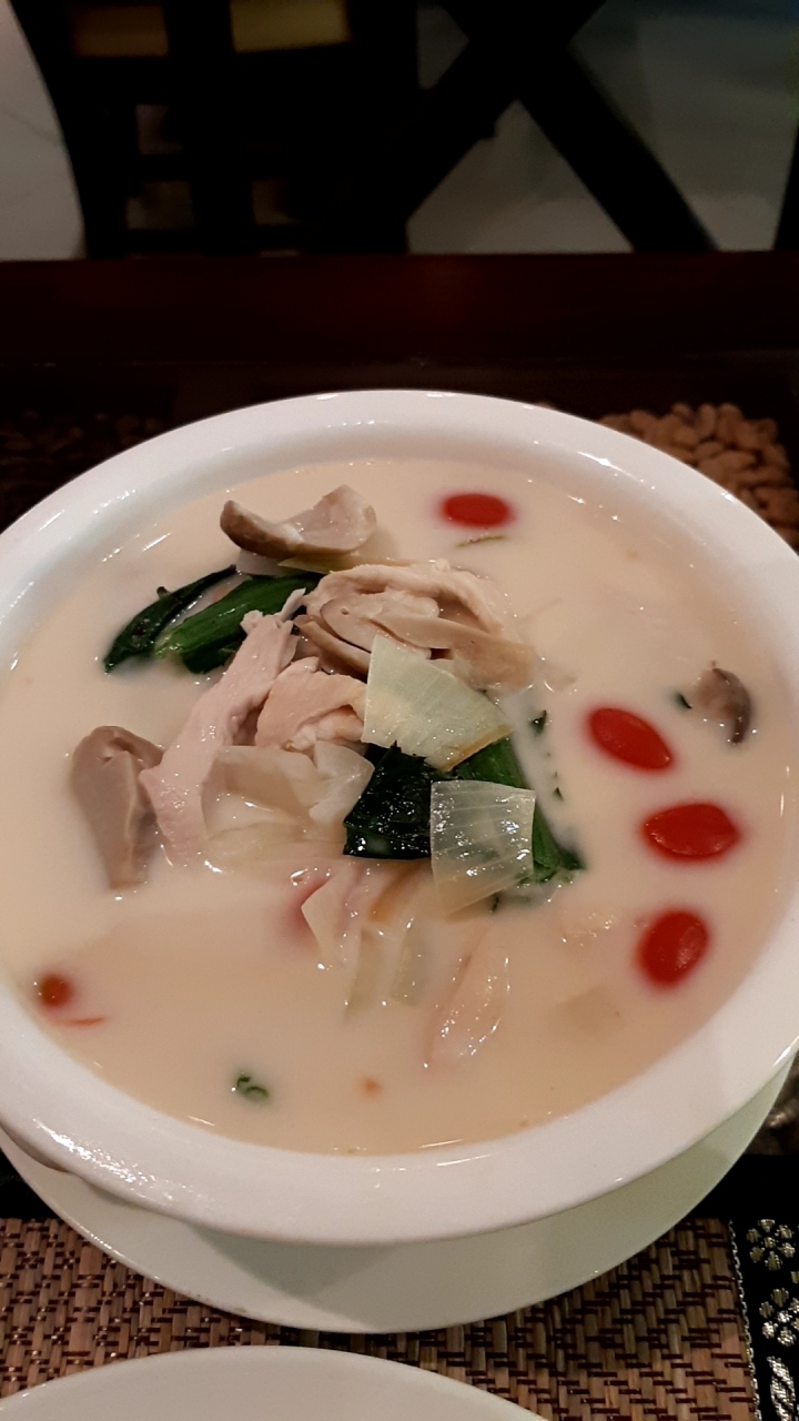 「トムカーカイ」というラオスのスープを注文。スパイスと酸味の効いたココナッツミルク仕立てのスープです。