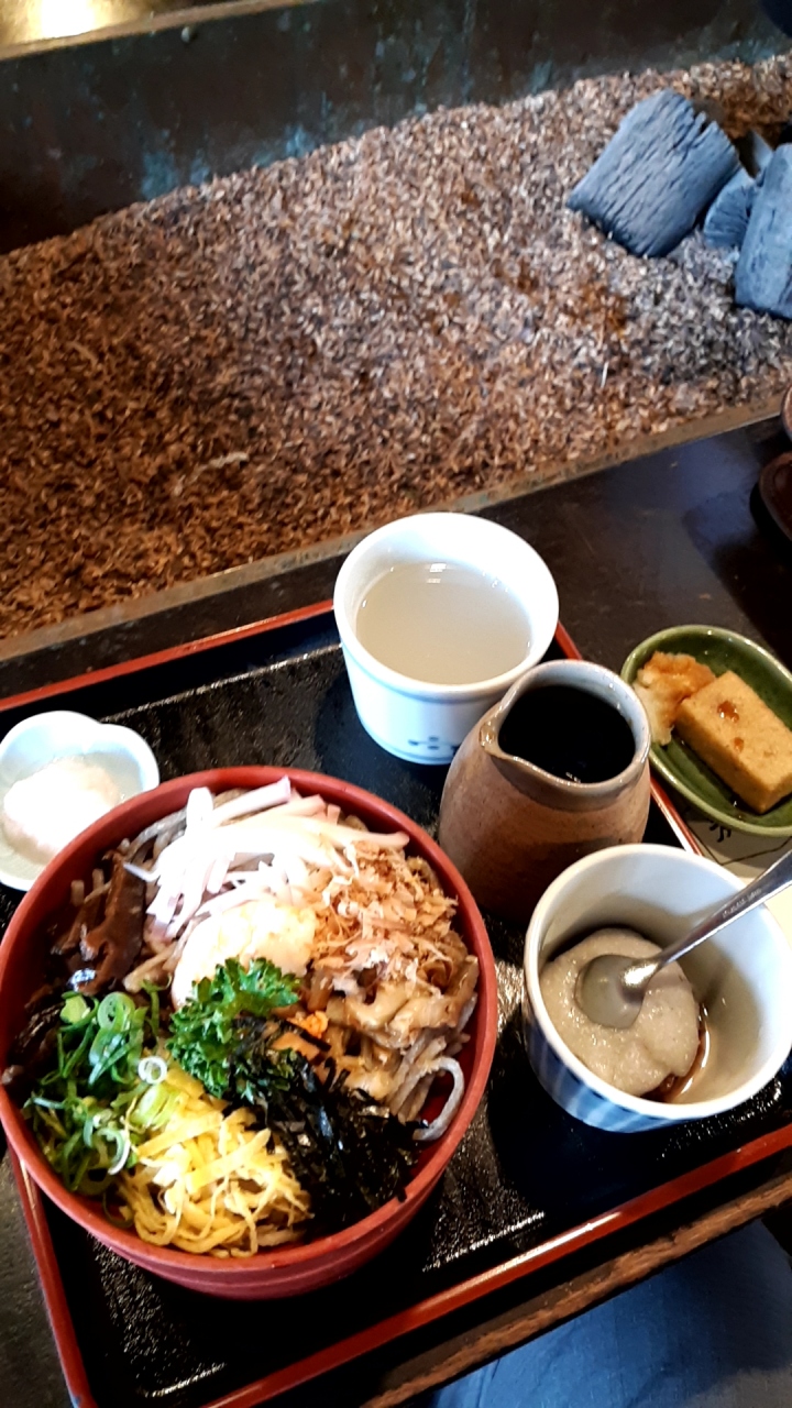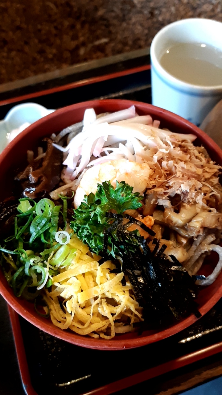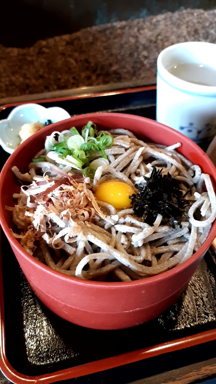 そばは、1段目には、エビや穴子やシイタケなどいろいろ入っていて、2段目は、卵黄の入っている月見そば。3段目は、とろろ蕎麦です。