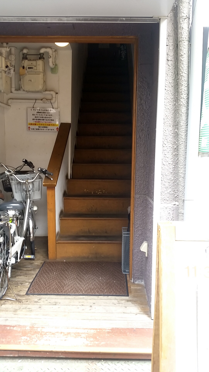 入口は狭く、すれ違うのも難しい狭い階段で2Fへ行くと入口があります。