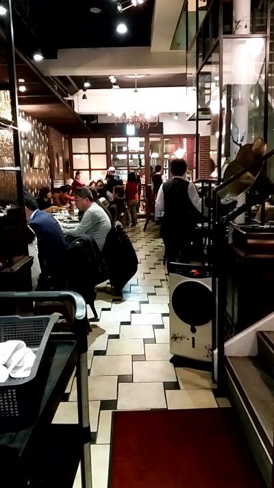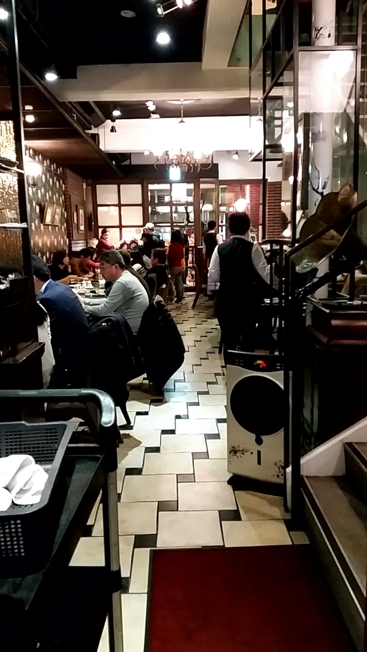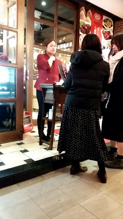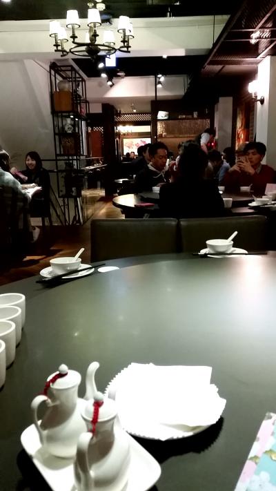 しばらくして、大きな丸テーブルの席で相席なら早いというので、店の中に入り、店内エレベーターで3Fまで上がりました。