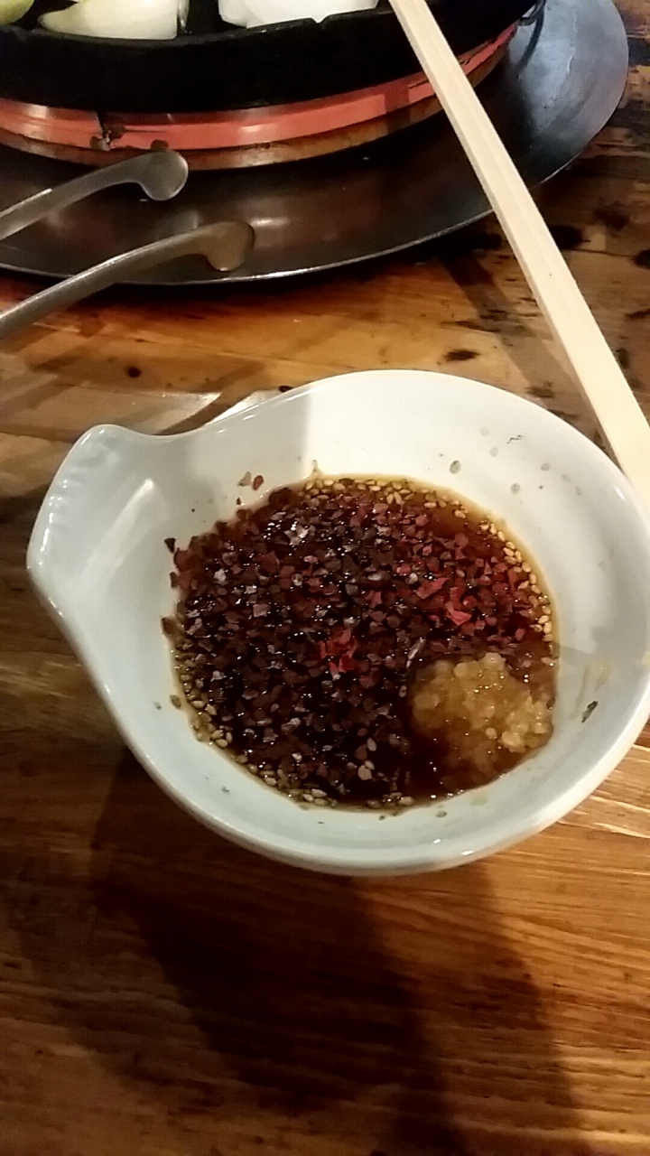 炭火の窯にジンギスカン鍋を置き、野菜を並べてスタート、、、たれは、好みによって2種類の薬味を入れますが、それほど辛くないし、とても美味しい。お肉にとてもマッチしてました。
