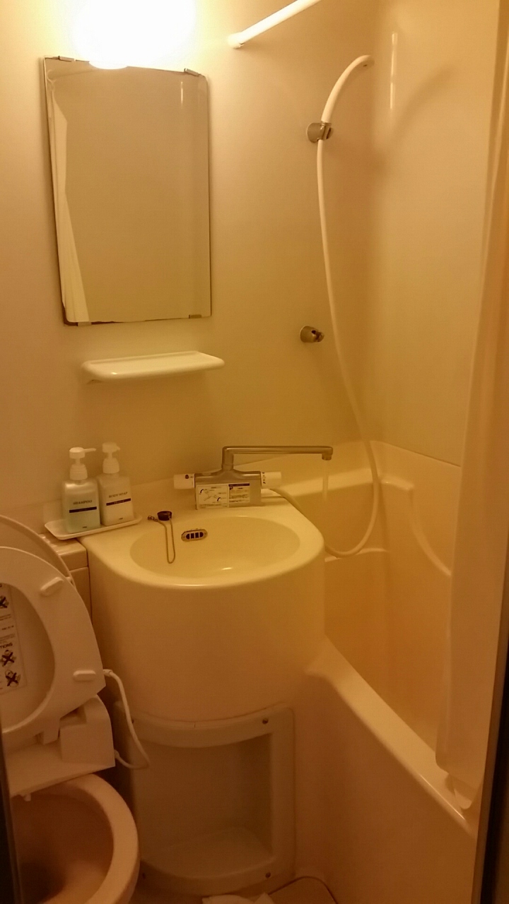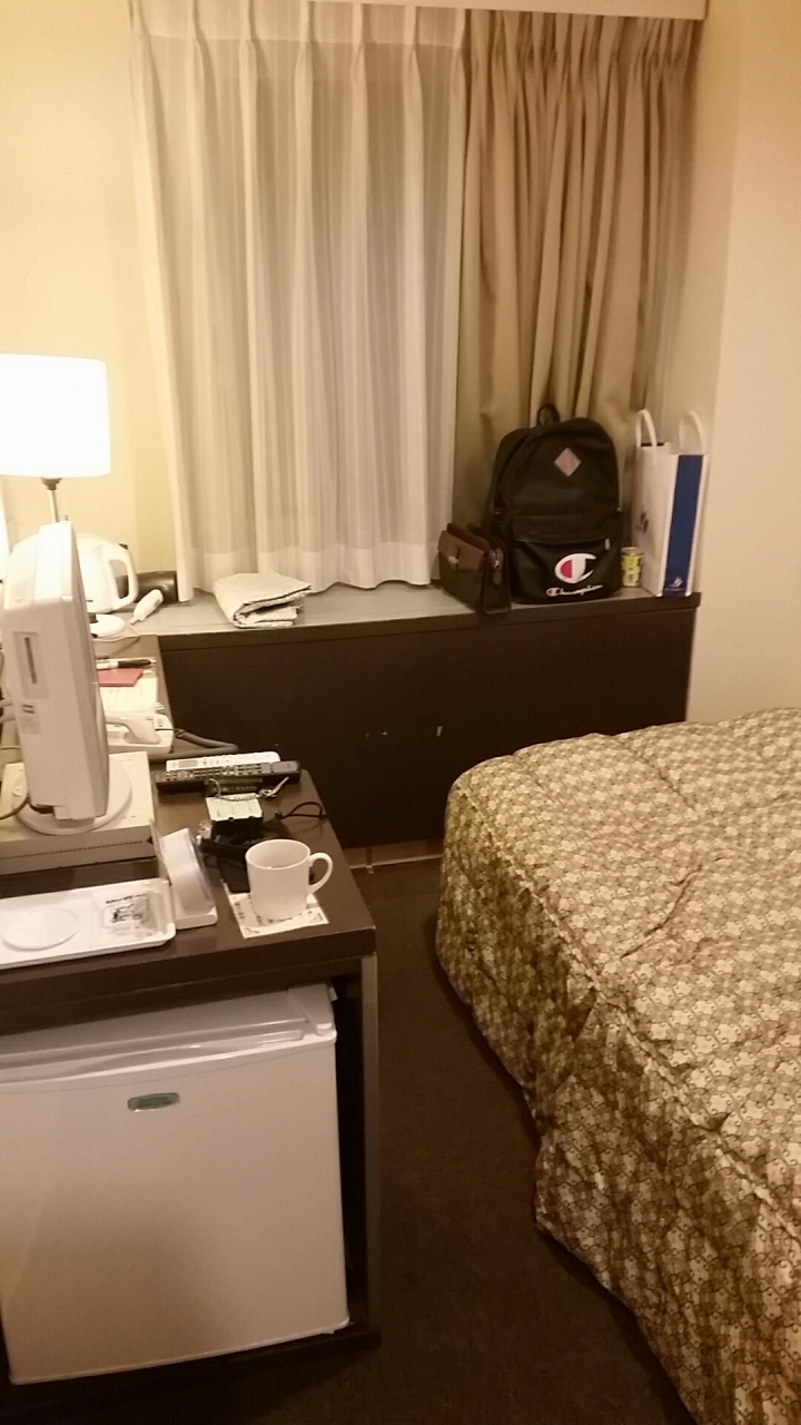 部屋の方は、やはりビジネスホテルなんで、部屋はとても狭いですが、割と清潔感もあって、空気清浄機も設置されてました。アメニティ類も最低限は揃っています。
