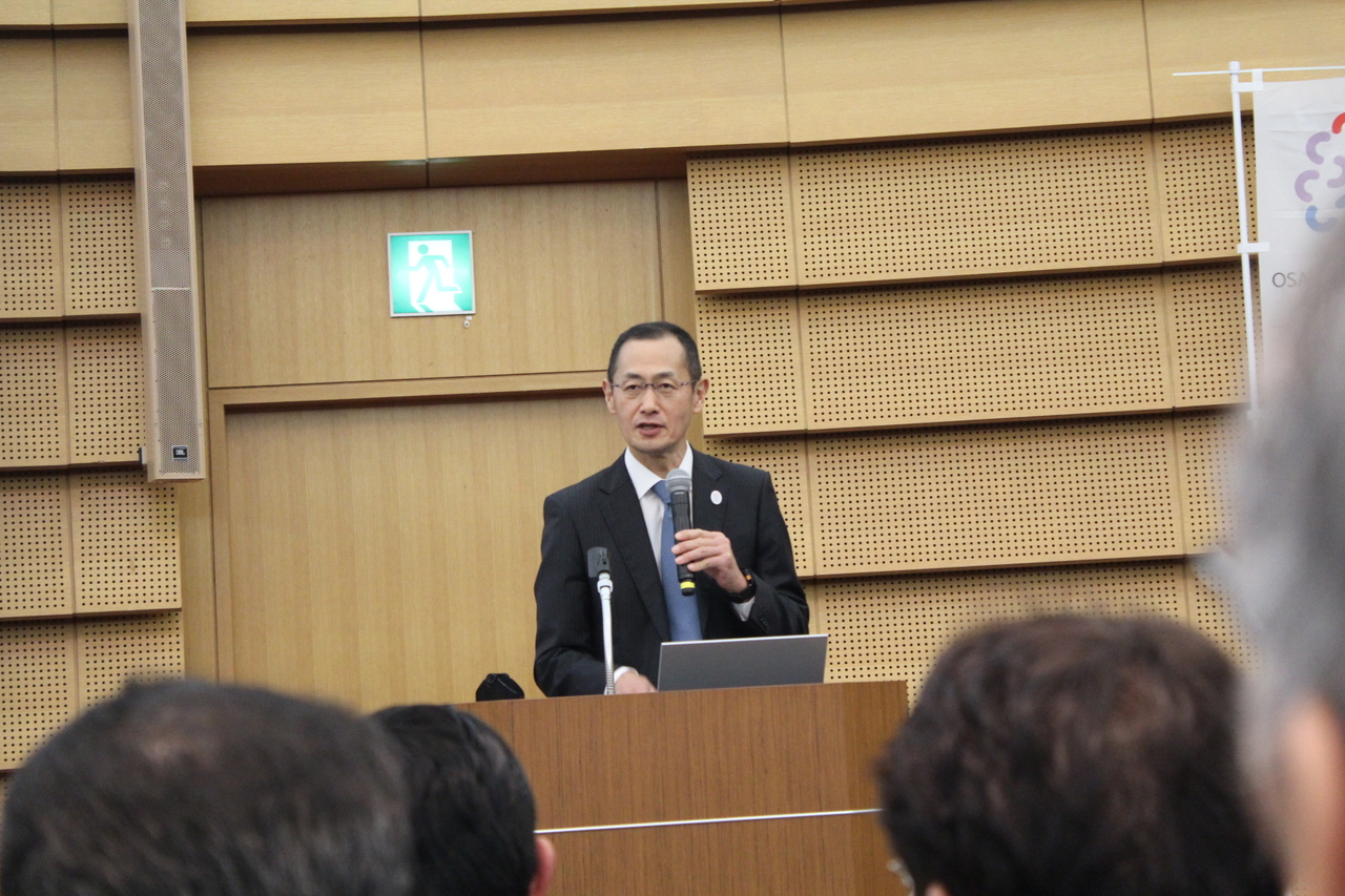 大阪府の松井知事、大阪市の吉村市長のあいさつの後、IPS細胞でノーベル賞を受賞した山中先生の基調講演がありました。