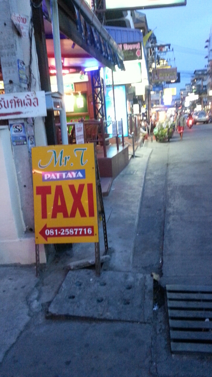 なお、パタヤ滞在中。LKメトロ近くにMr.Tタクシーの事務所看板を見つけたが、別に事務所に立ち寄る必要もないので、スルーした。。。- 旅行時期