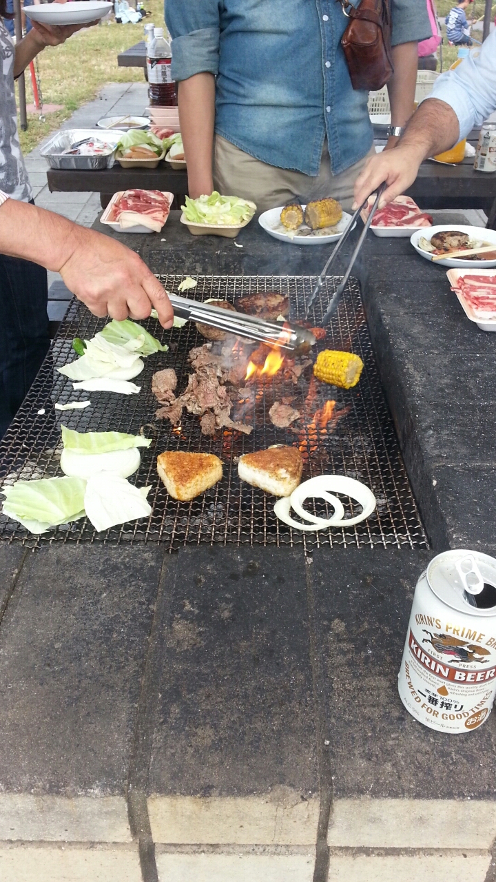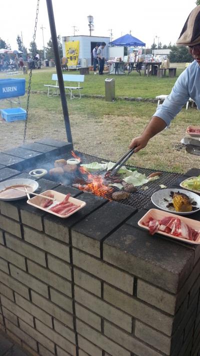 - 炭火での野外バーベキュー。美味い。