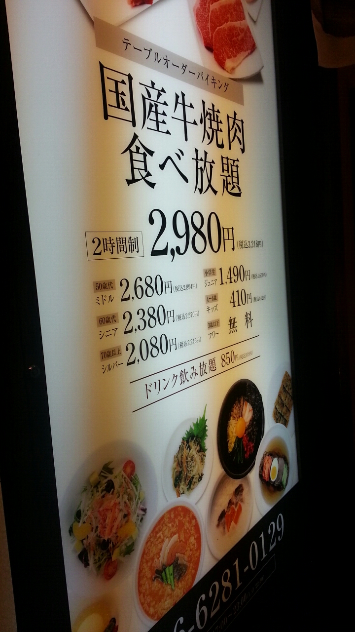 写真のとおり、2時間制の食べ放題で、年齢に応じて料金設定されているところが面白い。飲み放題のメニューも飲み放題にありがちな安っぽくてまずい酒は少なかった。生まっこりが中々おいしくて4杯おかわりしてしまった。。。肉以外のサイドメニューも充実してます。家族連れでも良いんではないかと思います。
