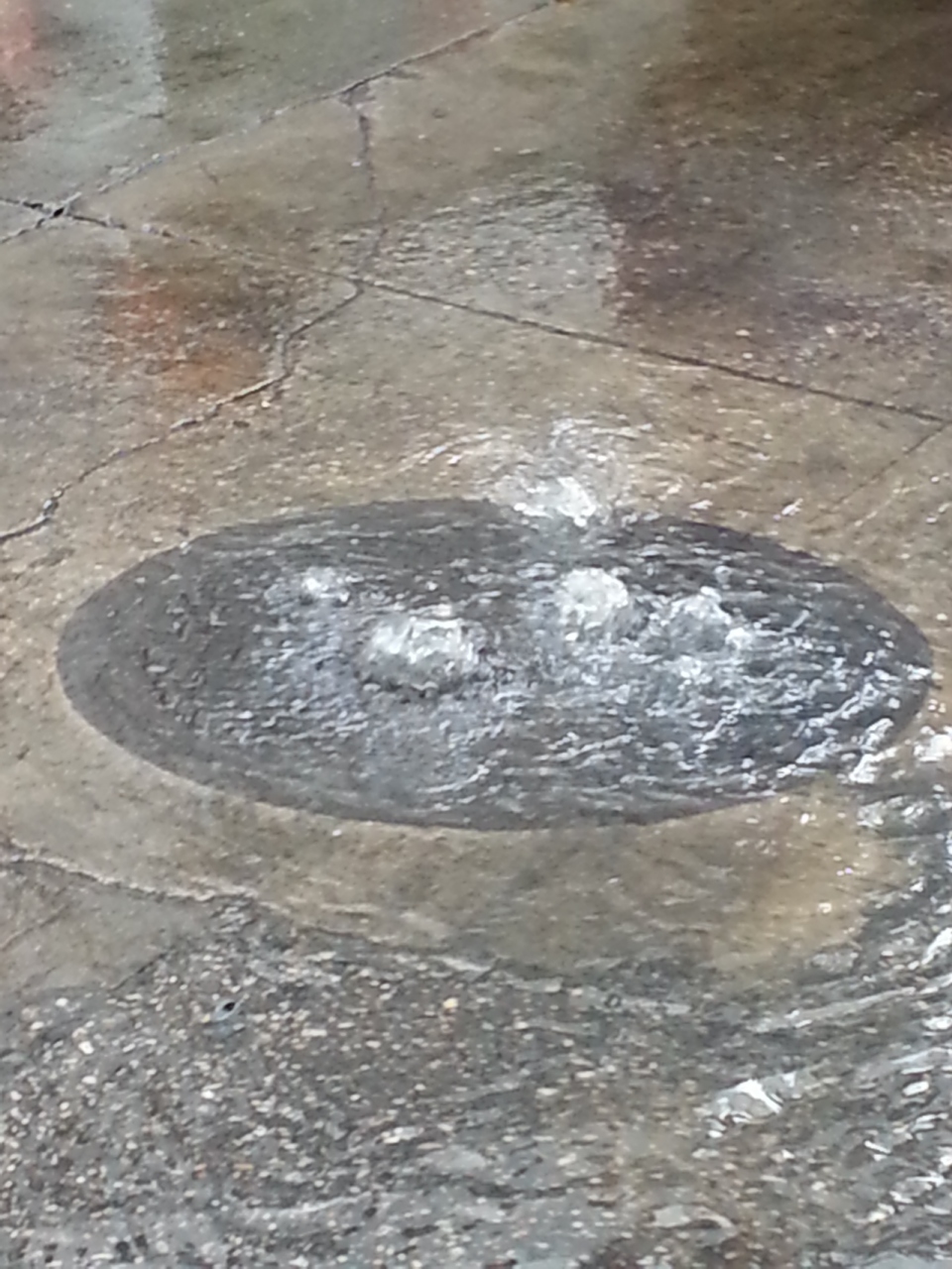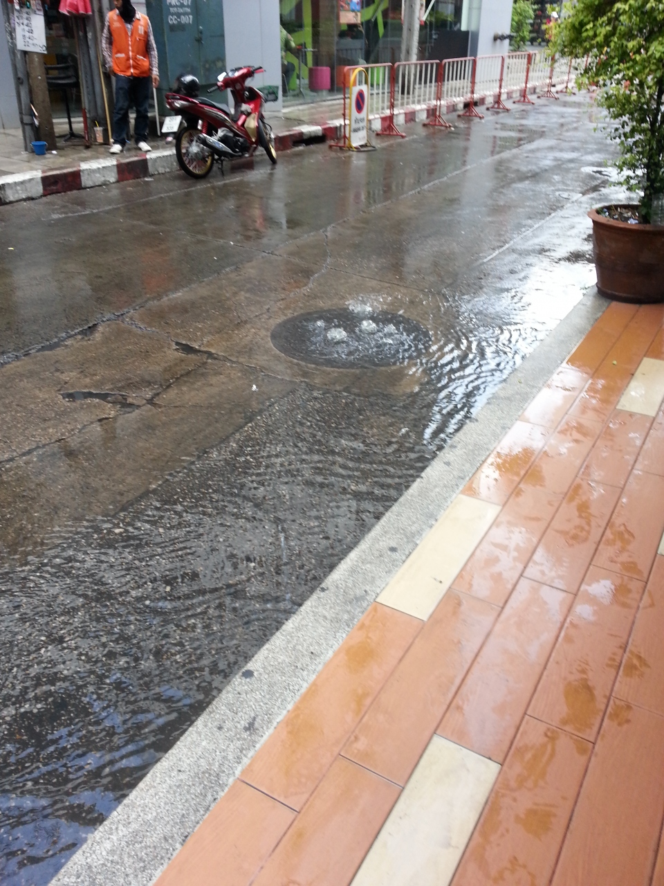 バンコクのスクンビット通りですが、今年のGWに一人旅に行ったときに、スコールがあった直後です。写真のとおり、下水の水はけが悪く、マンホールから水が噴き出していました。