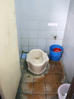 タイの伝統的なトイレは、ご存じのとおり写真のような形式です。日本の和式にも似ていますが、日本の和式のように、排水口を前にしてしゃがんではいけません。タイのトイレは水洗は水洗ですが、自分で水を汲んで流す必要があるので、排水口を後ろにして、汚物が流れやすいようにしないといけません。