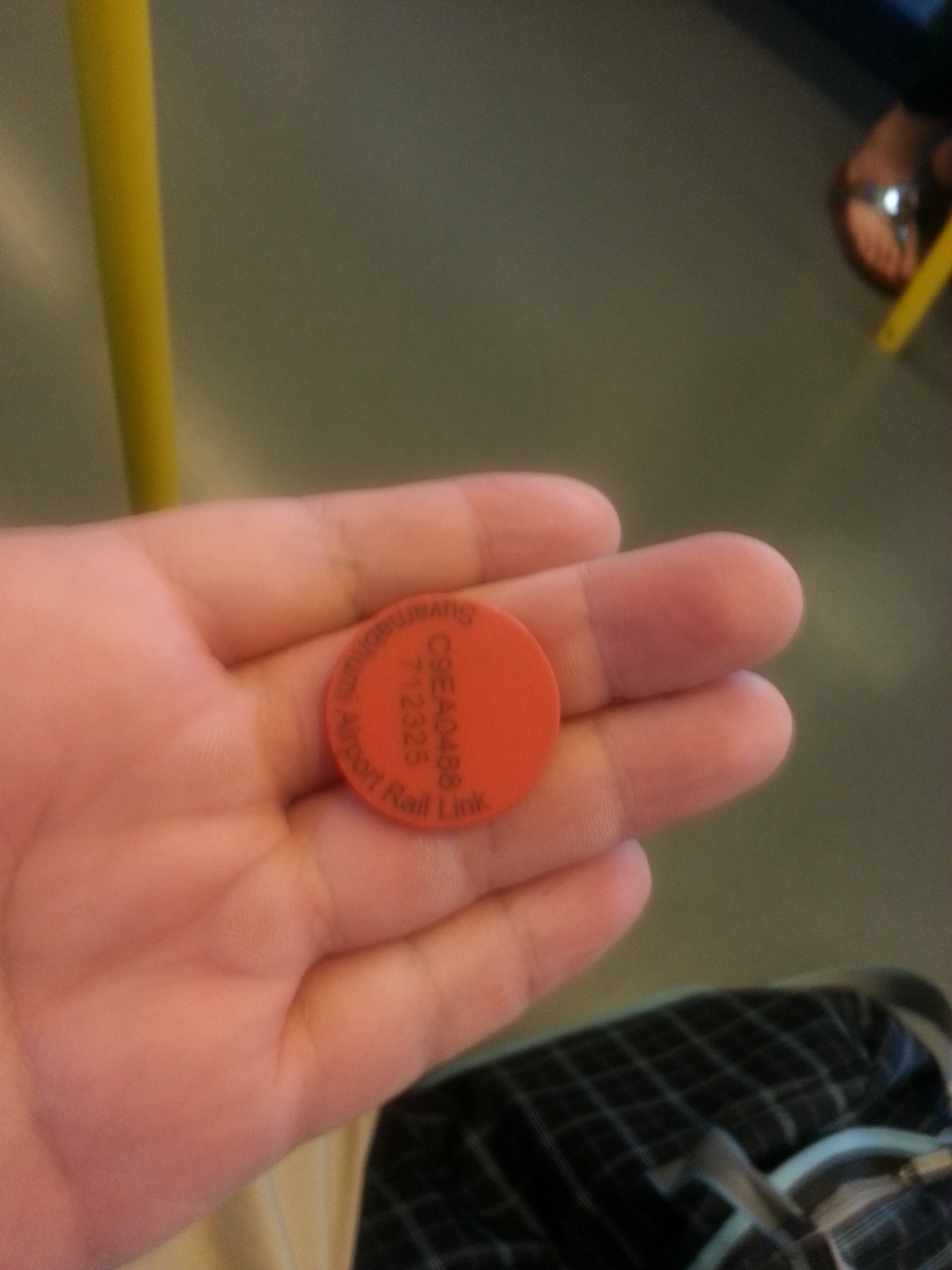 駅では、自動販売機で行き先ボタンを押して、お金を入れれば、写真のような黄色のICタグのコインが出てきます。これが切符になりますので、改札の読み取り部分にコインを当てれば、改札を通れます。到着して改札を出る際は、コインを入れるところがあるので、そこにコインを入れれば、通れます。