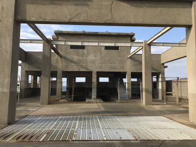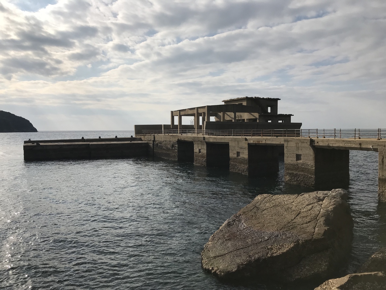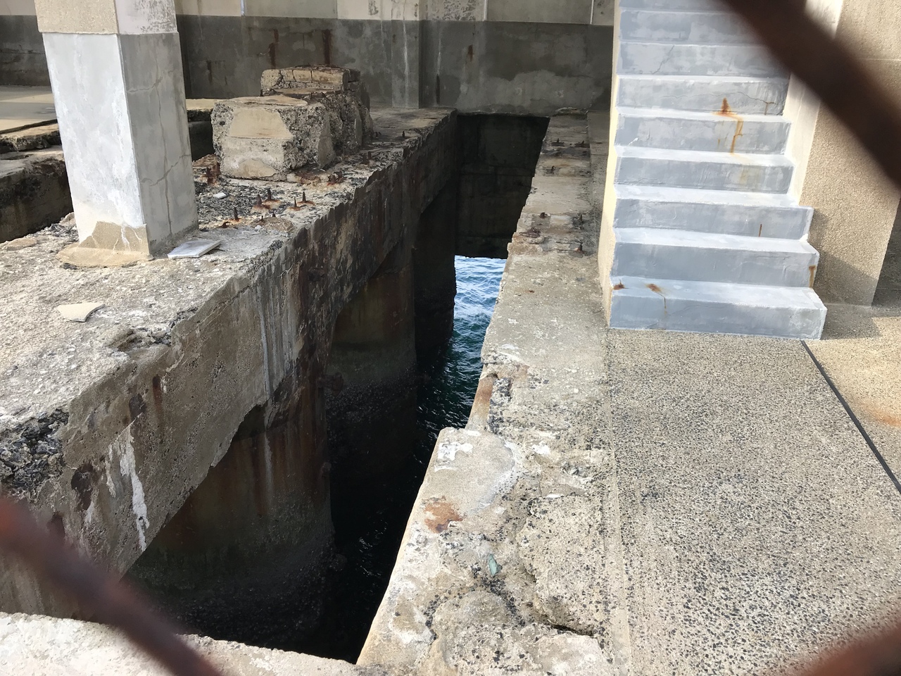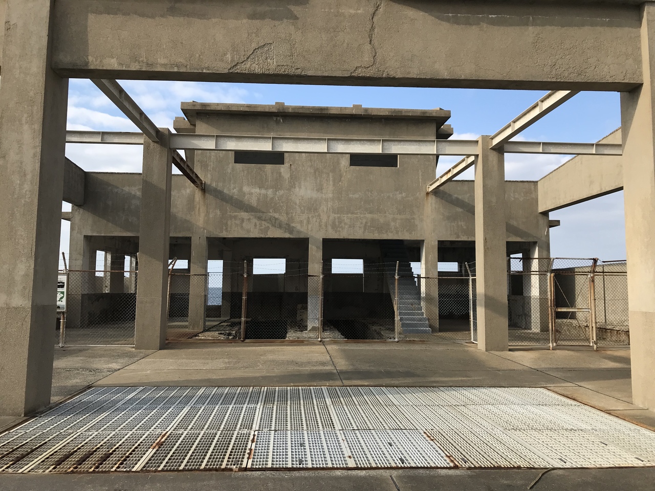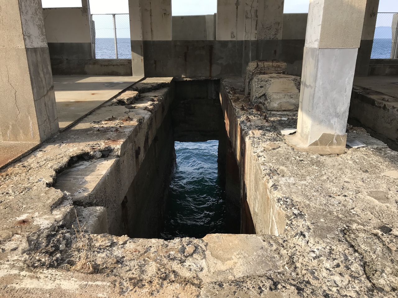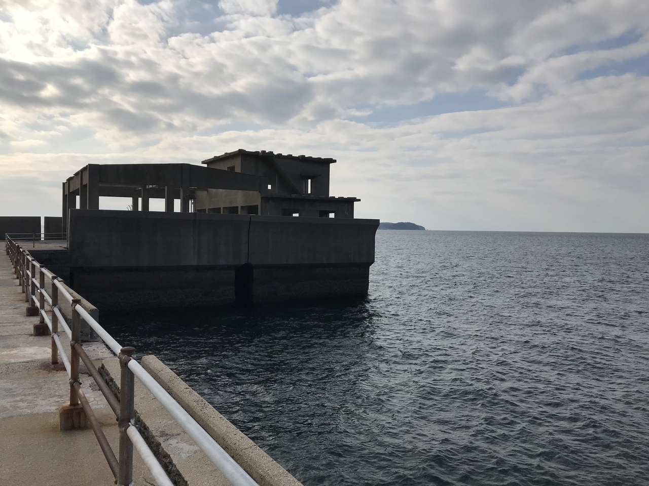 陸地から橋で結ばれ、海に浮かぶように、コンクリートの廃墟の塊が目に入ってくる。