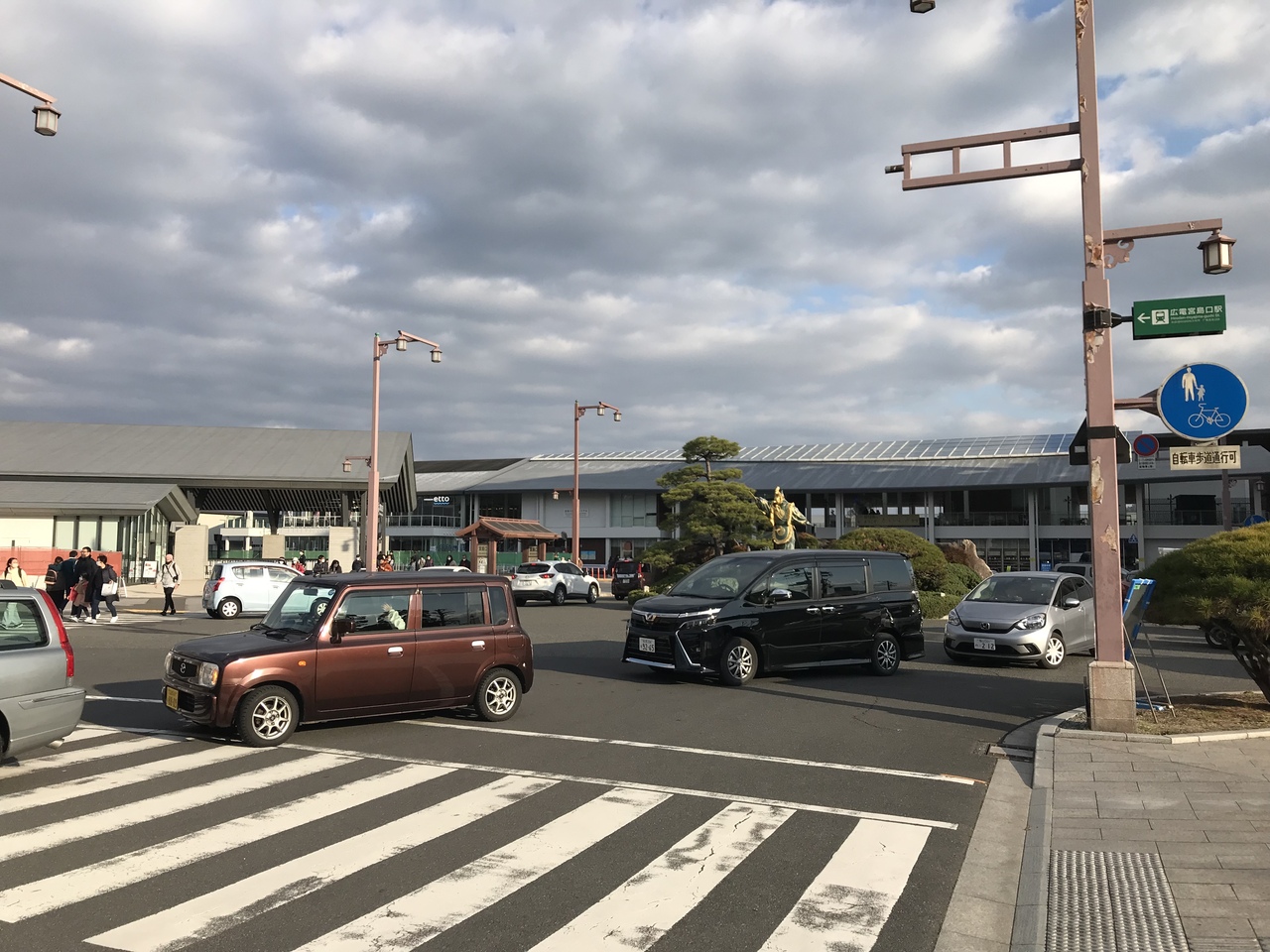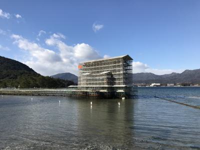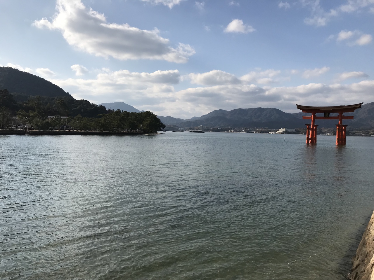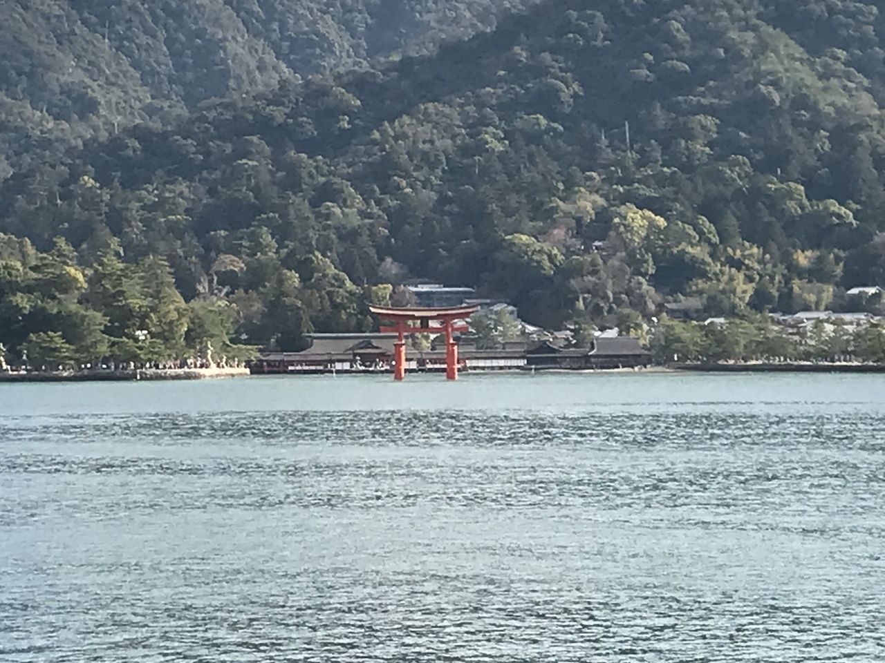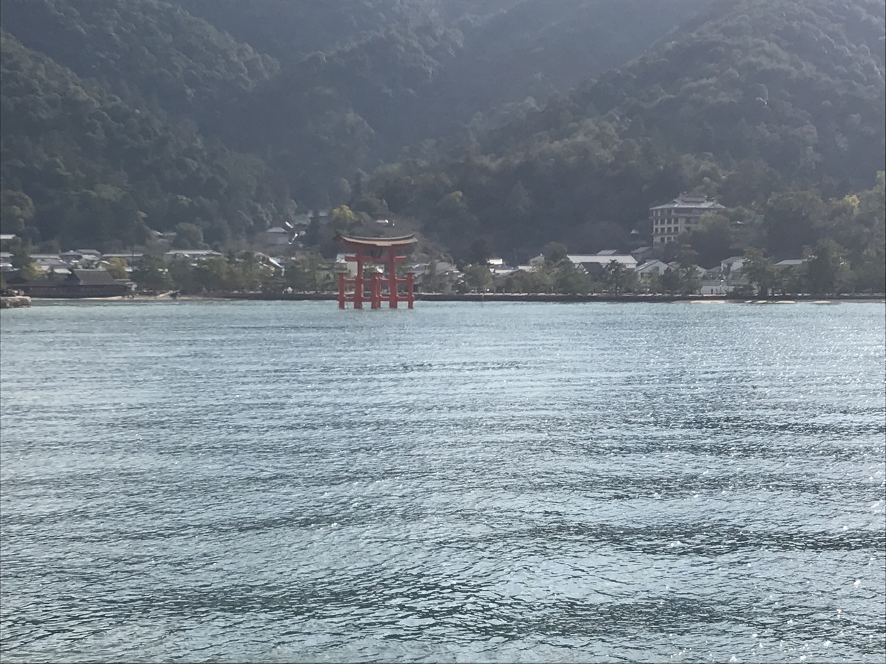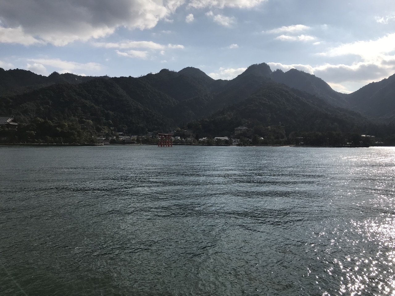 厳島神社の鳥居を眺めるには、鳥居方向に迂回して宮島港に向かうJRのフェリーに乗船する。