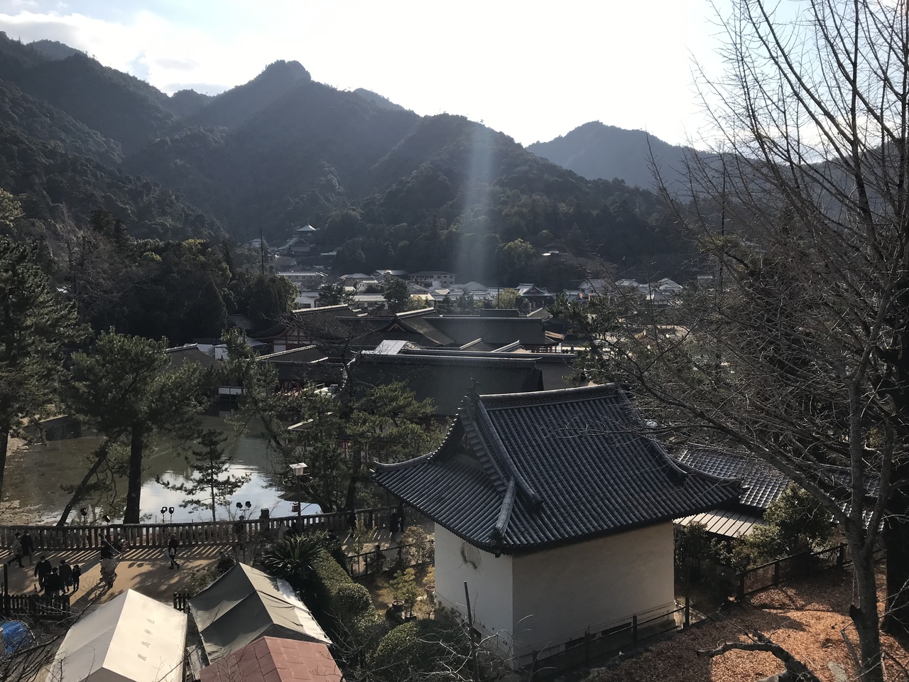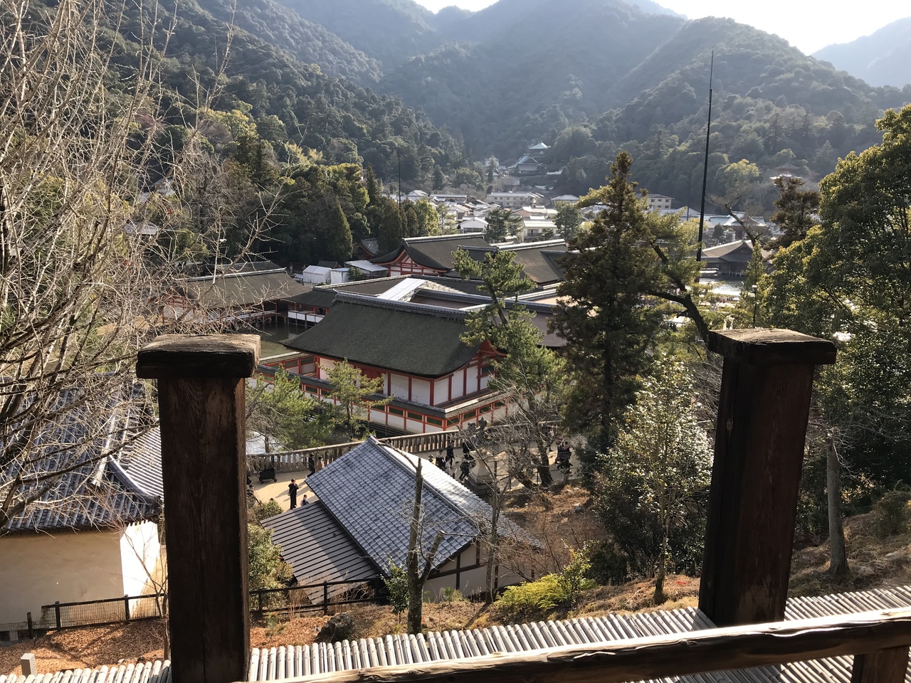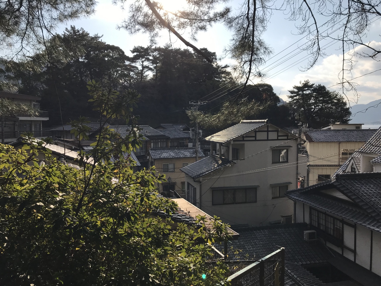 宮島の厳島神社脇の高台にある建物の縁側は厳島神社のビュースポット。