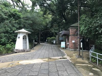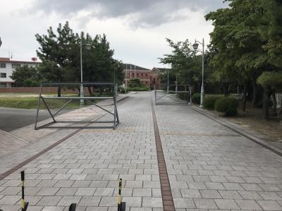 侵入を拒むように厳重警戒された感の閉ざされた門。海上自衛隊呉地方総監部の門越しに内部を見る。