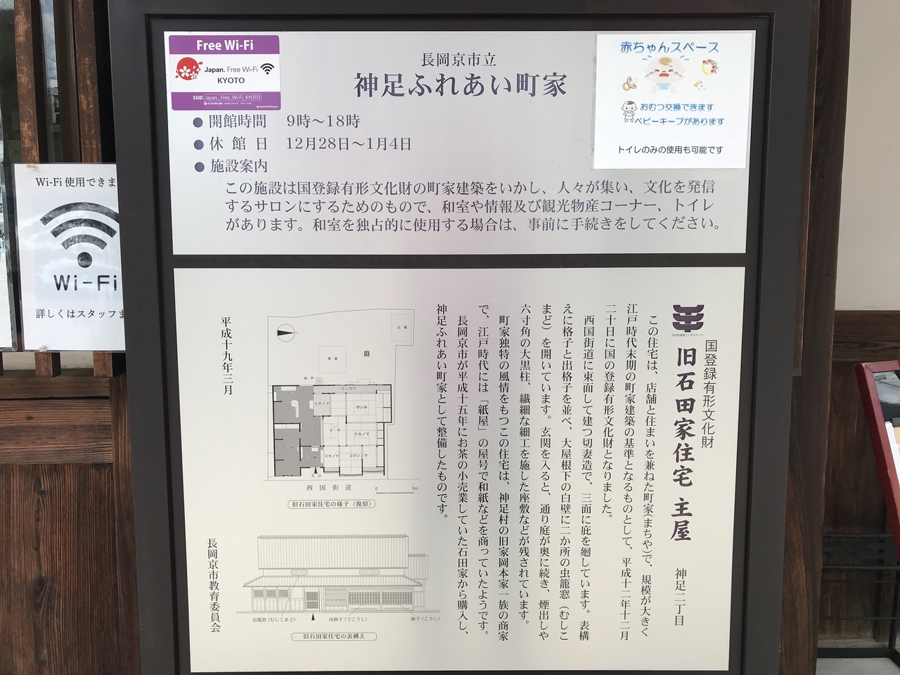 西国街道にある江戸時代の商家旧石田家住宅を「神足ふれあい町屋」として開放している、西国街道を歩いた立ち寄り休息場所。