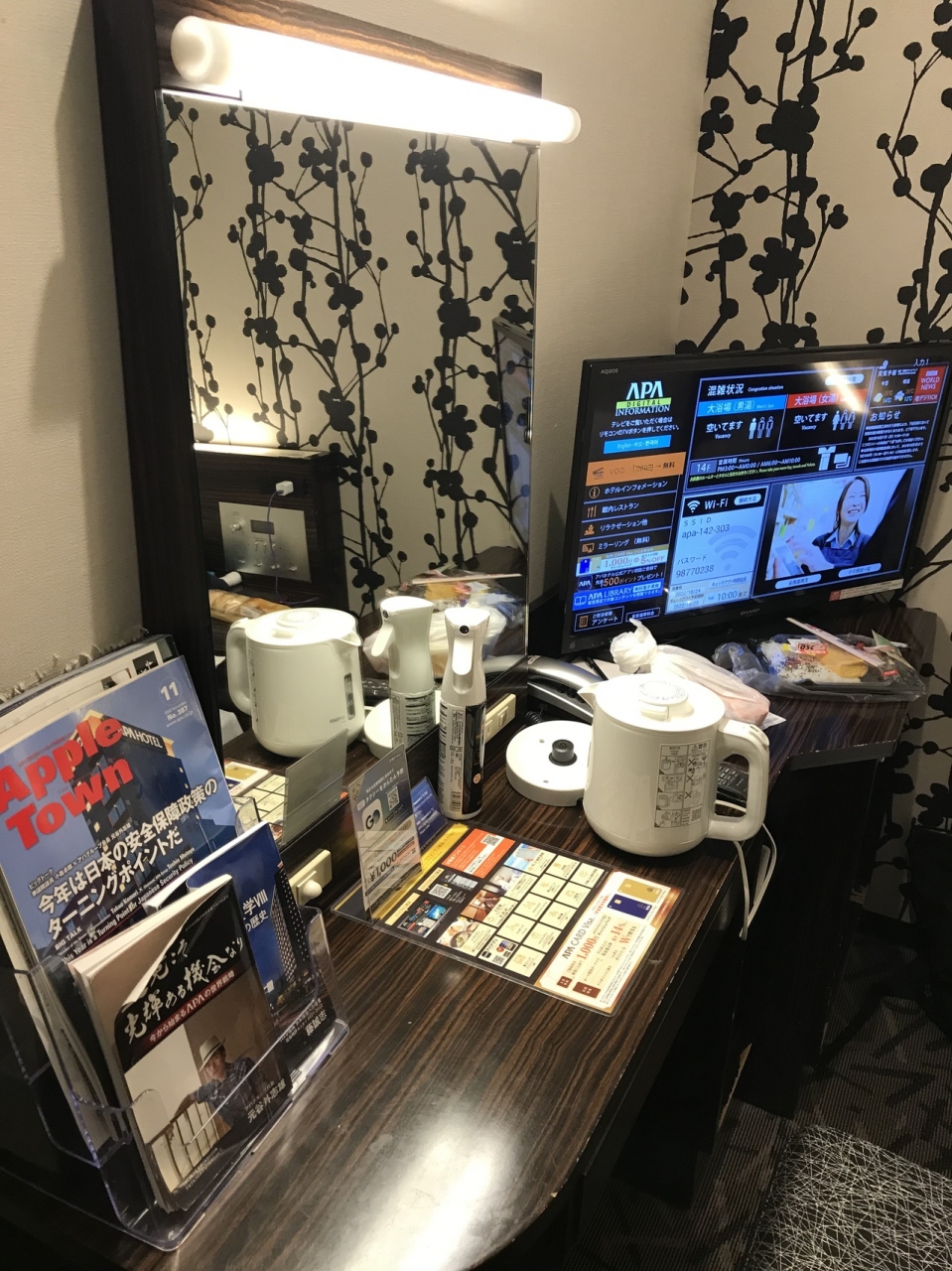 更に狭いテーブルの上には、アパホテル独特の本が置かれ、部屋をより以上に狭さを感じさせ、圧迫感がある。