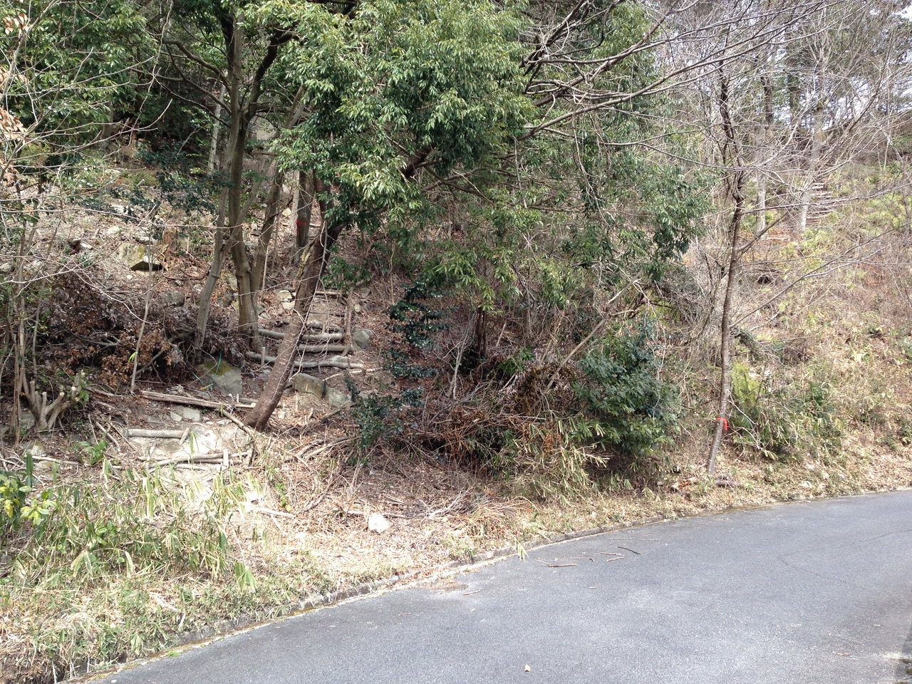 分岐に戻らず、そのまま木に掲げられた赤いリボンを目印に下る。観音正寺に続く車道に出た。この下りのコースは、現状は整備不足で、山歩きに慣れていない人には危険度が高く不向きである。