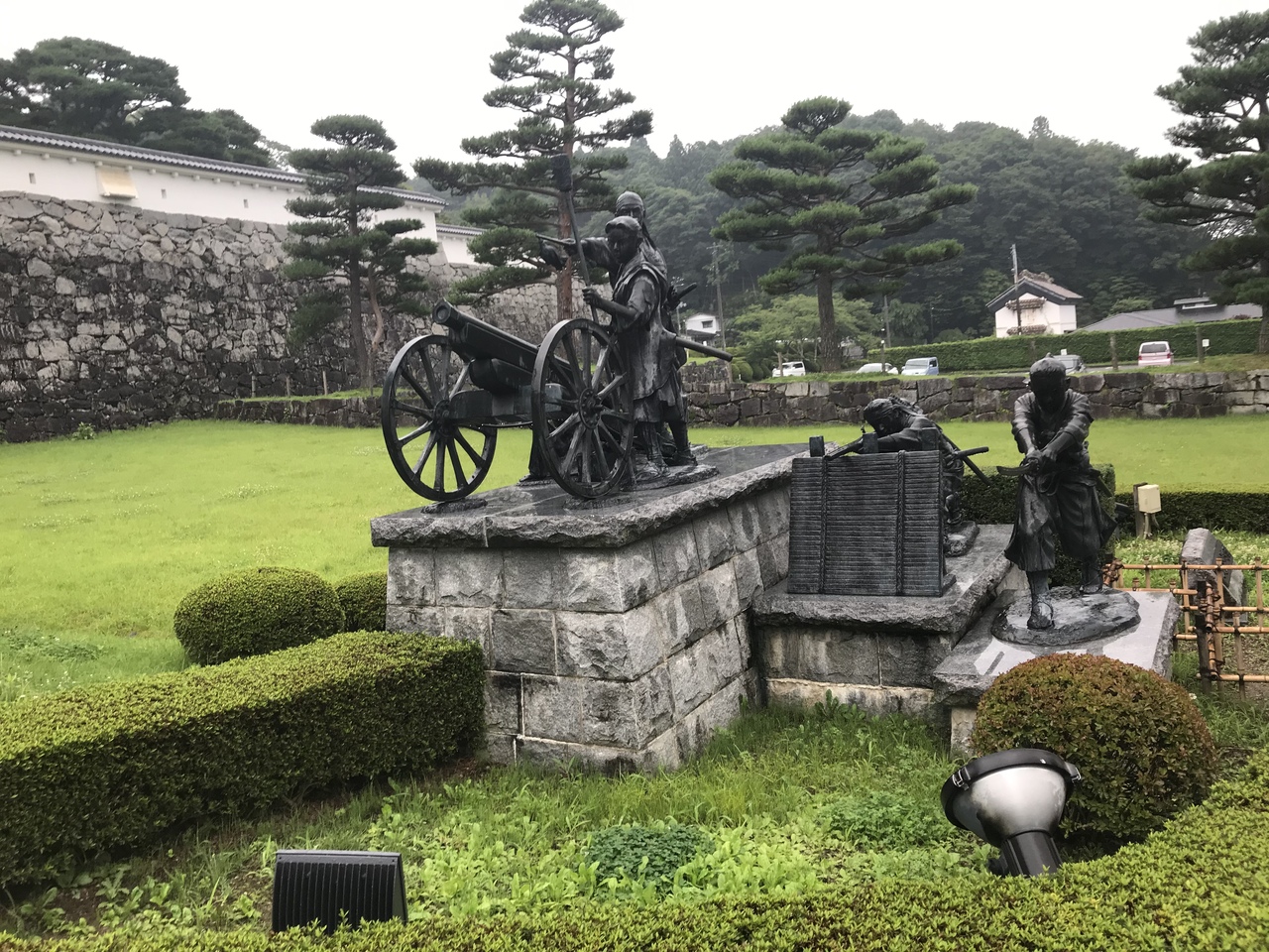 二本松城箕輪門前に建つ、戊辰戦争二本松最大の激戦地「大壇口戦場」における少年隊の奮戦姿と垣根の挟んでわが子の出陣服を仕立てる母の姿、の像。