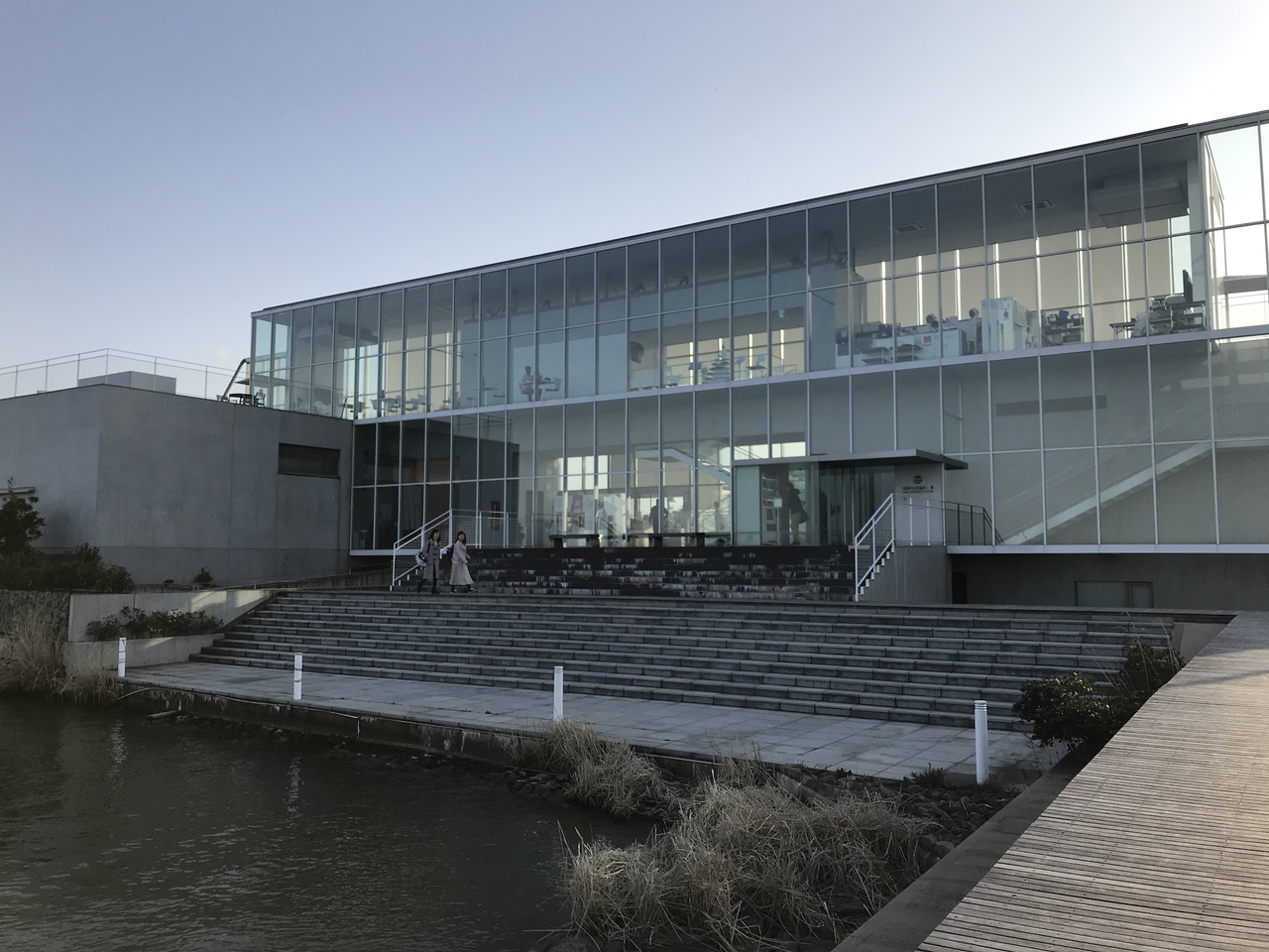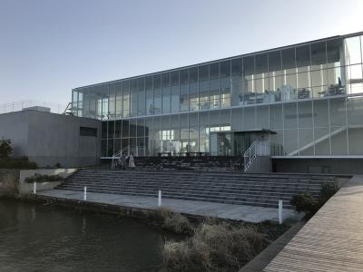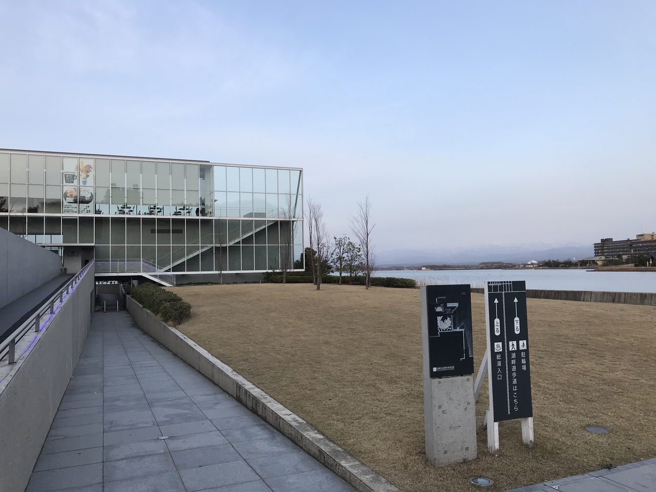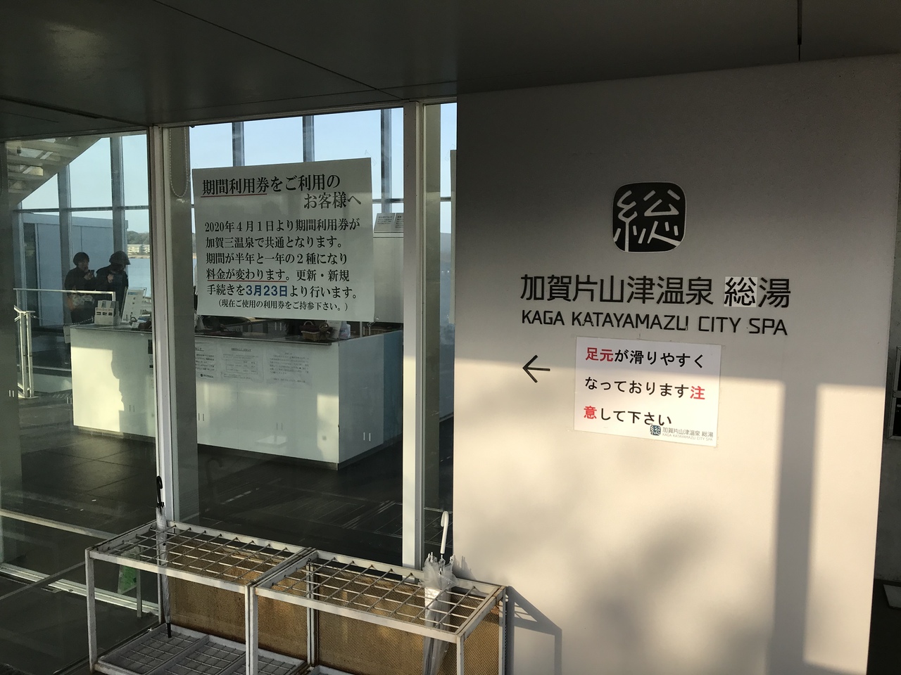 片山津温泉総湯のバス停を下車すると直ぐ、柴山潟湖畔にある温泉施設とは思われないガラス張りの建物が総湯。
