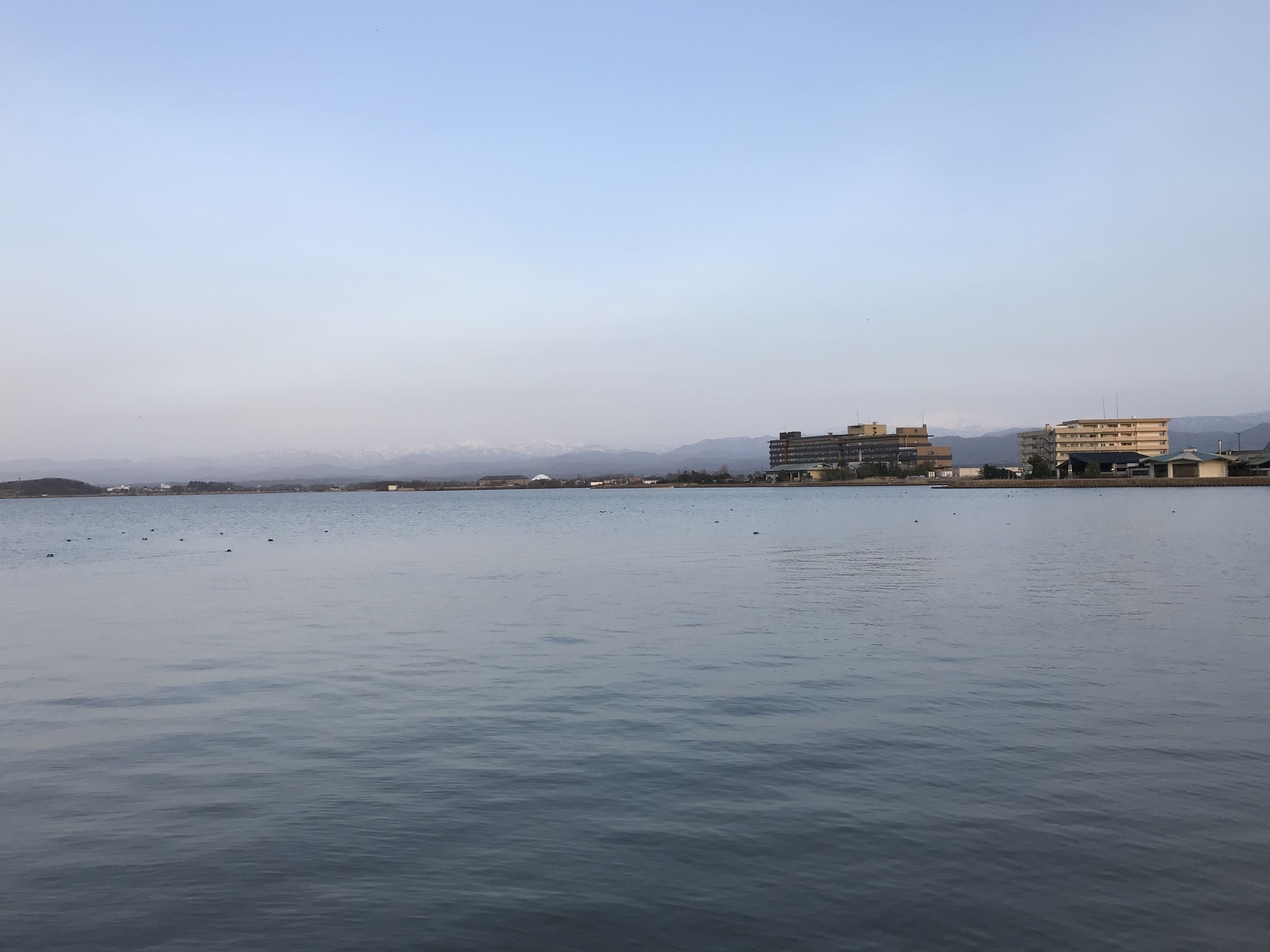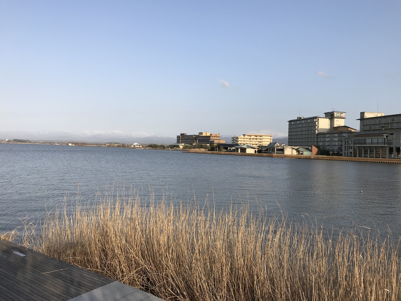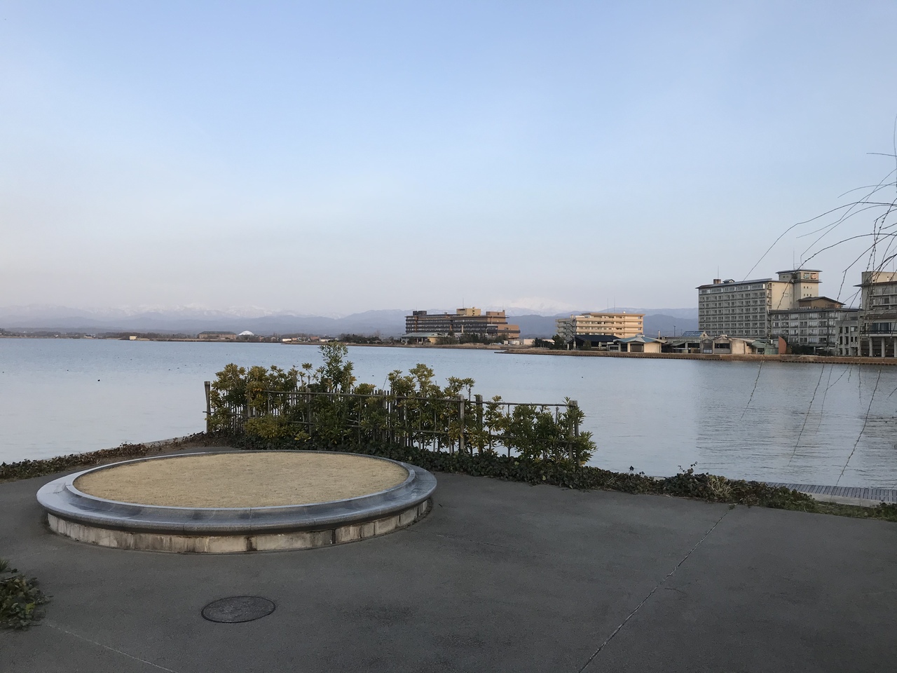 「潟の湯」の窓からは、柴山潟が見え水面と浴槽の水が連続し、あたかも潟に浸っているような幻想的な感覚が楽しめるらしい。