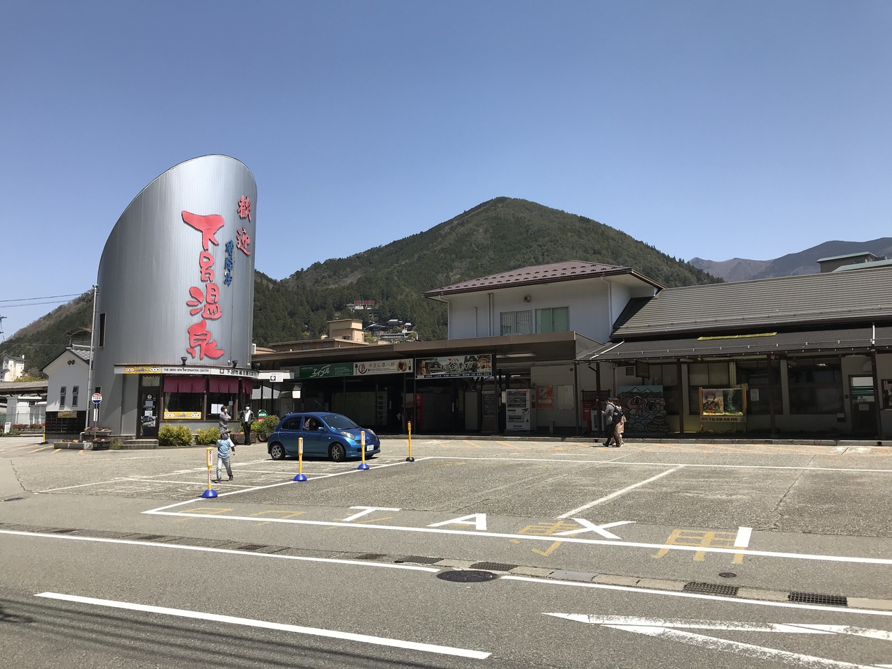 下呂駅改札口を出ると右手に、銀色の円錐形の塔に赤文字で歓迎下呂温泉と表示された特徴のある印象的な建物が観光案内所だ。
