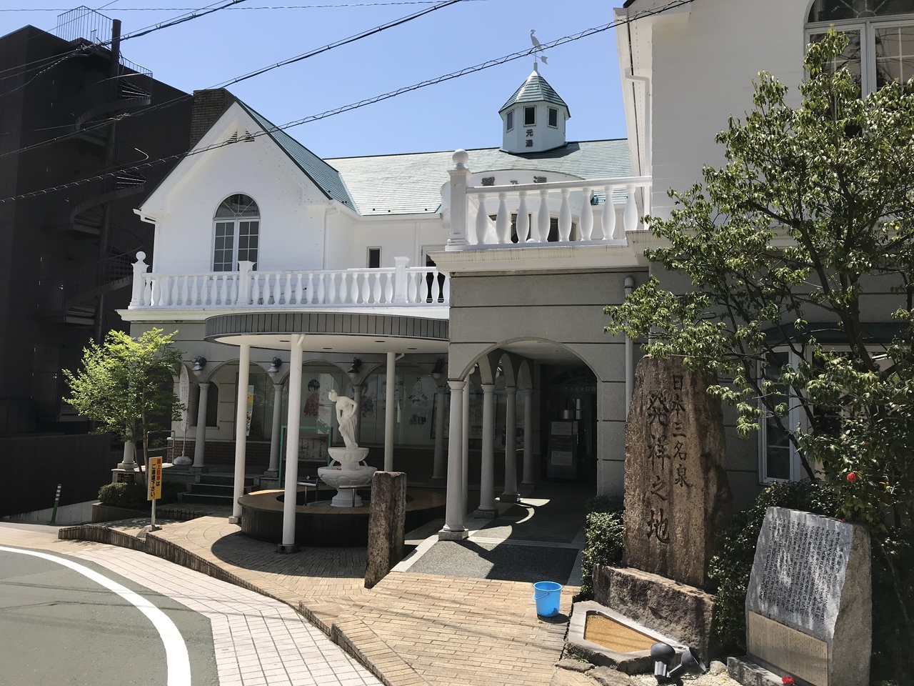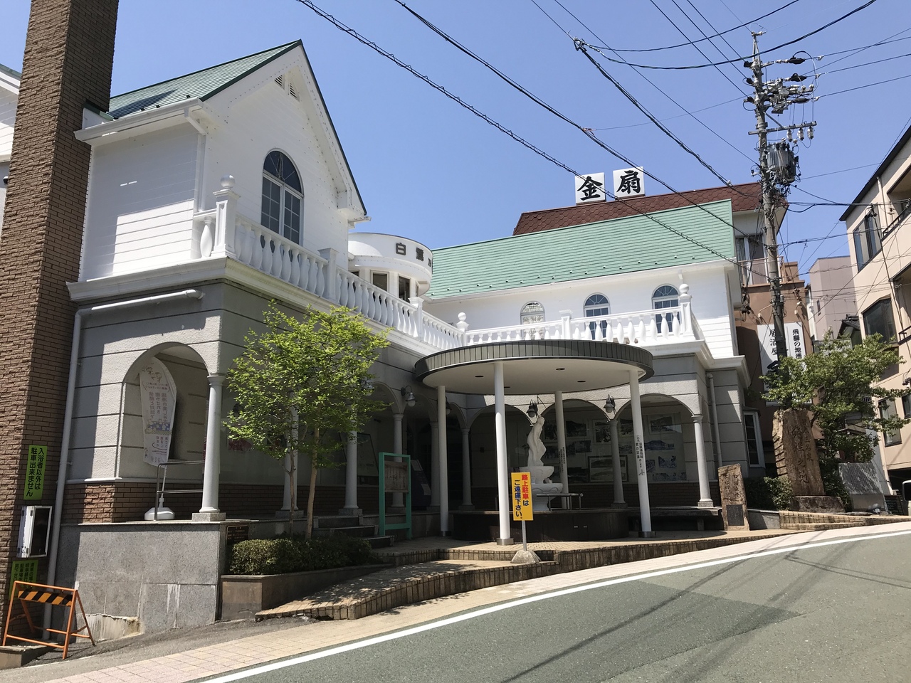 飛騨川沿いのロマネスク風の白い洋風建物の共同浴場。入口にはビーナスの足湯がある。
