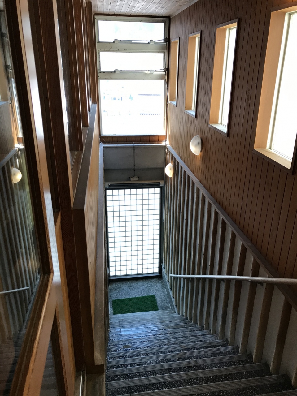 1階入口で入浴料を払い、2階脱衣所に上がる。ガラス貼りの脱衣所から、1階の浴場へと下る階段と1階の浴槽、飛騨川の風景が。