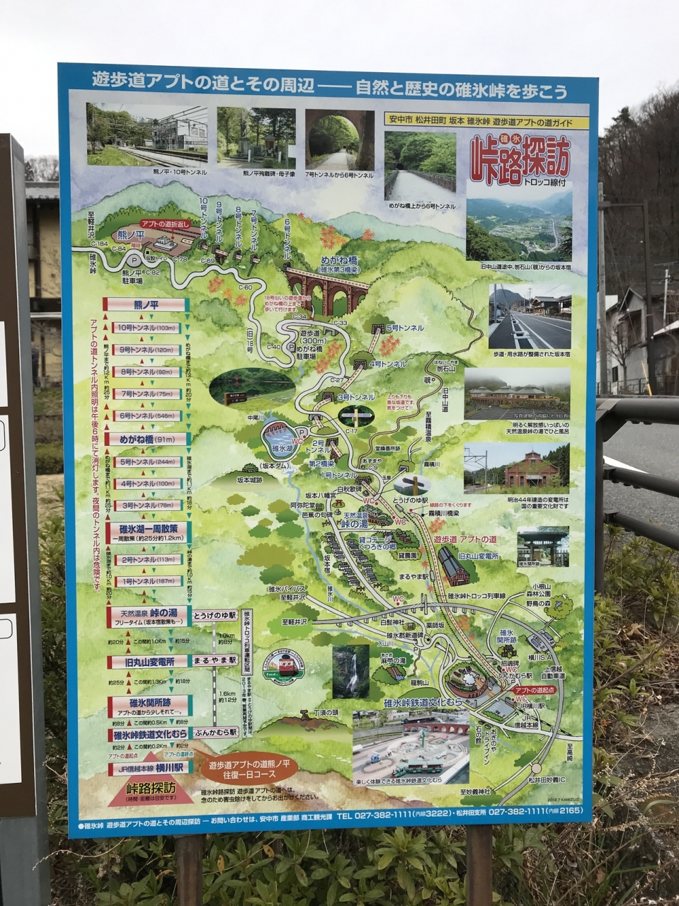 鉄道にとっては碓氷峠の急勾配の坂だったためアプト式の列車で走っていた路線の廃線跡が、横川駅から旧熊ノ平駅までの約6.5kmの区間がアプトの道としてハイキングコースとなっている。