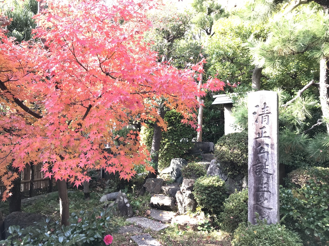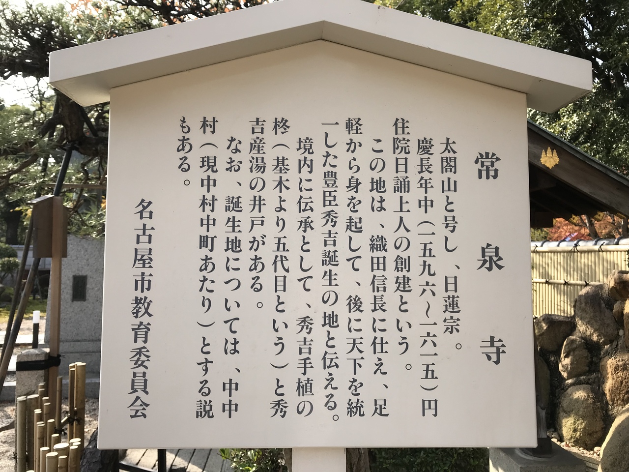 名古屋城築城時に、清正は城の余った資材を用いて誕生の地に再建したと伝えられている寺が妙行寺。隣接して秀吉誕生の地常泉寺がある。