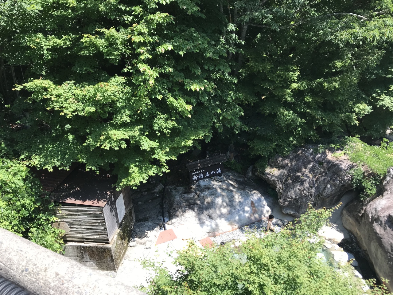 新穂高温泉の入り口にあたる蒲田川に架かる橋の袂にある超有名な露天風呂。