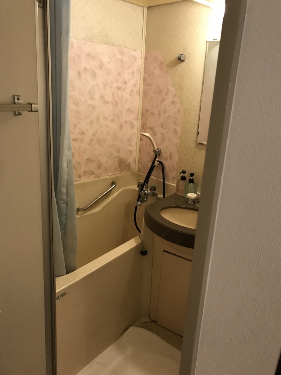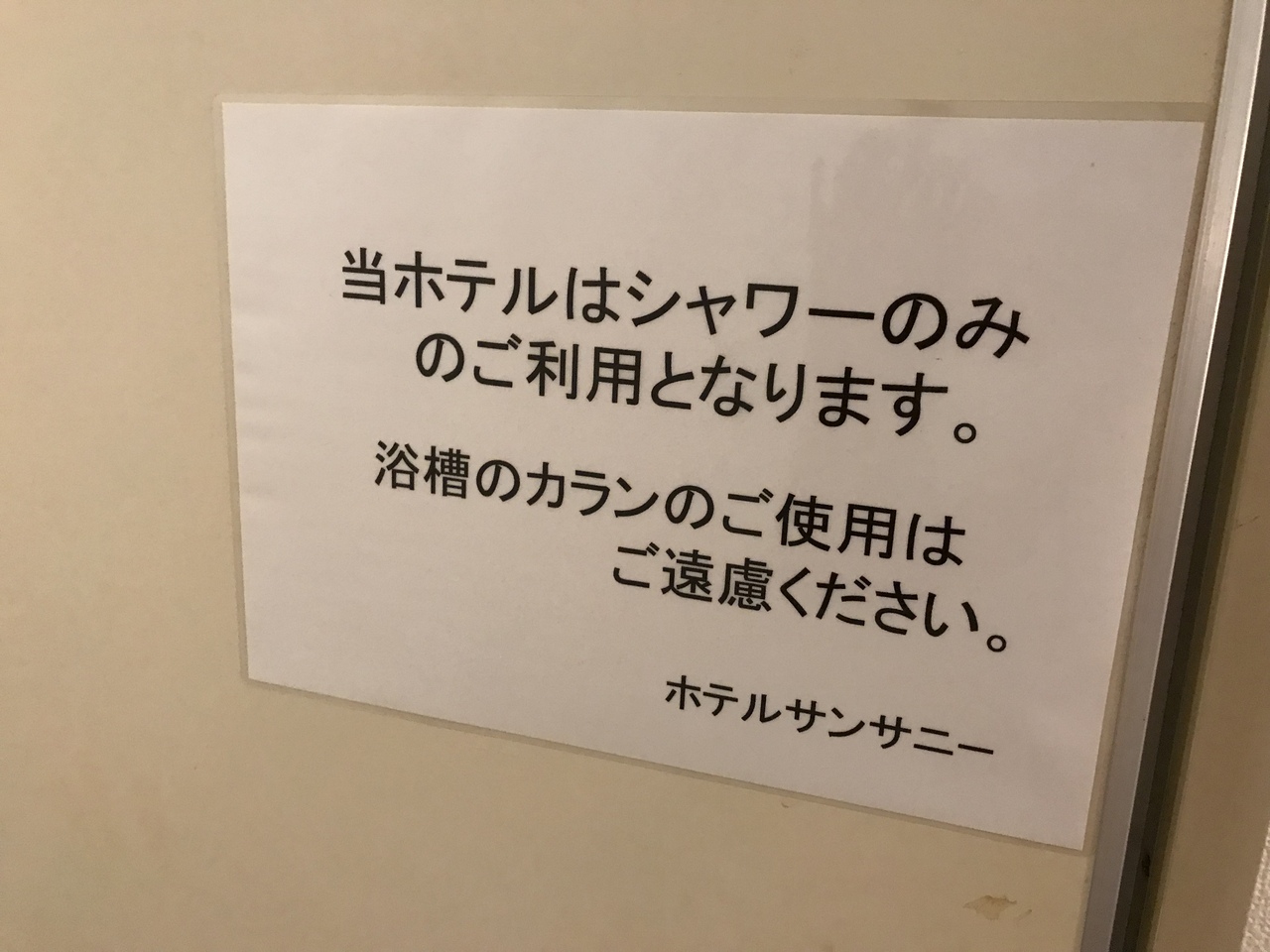 ユニットバスで、「浴槽に湯を張るな。シャワーのみ使用」の表示。