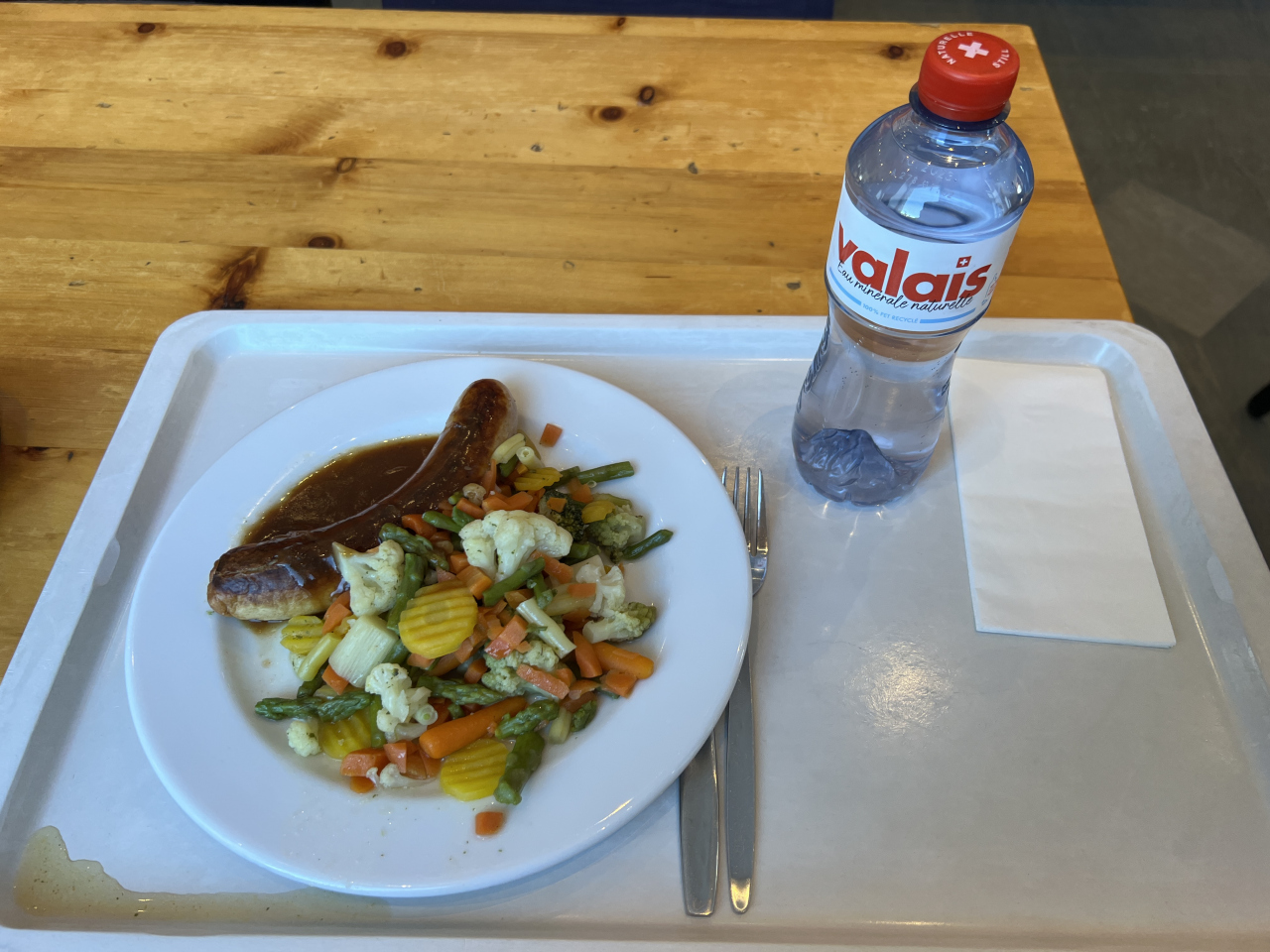 セルフのカフェ。注文するカウンターの上に写真付きでメニュがあります。ソーセージ、パスタ、チキンナゲット、豚肉のシュニッツェルなど。ドイツ語、フランス語、英語の表記があるので楽。私は、仔牛のソーセージで野菜の付け合わせ付きを食べました。大変美味ですね。付き合わせの野菜も美味しい。雰囲気はとても良いです。テーブルは木製。地元の人らしい人、働いている人も食べに来ていました。混んではいませんでした。