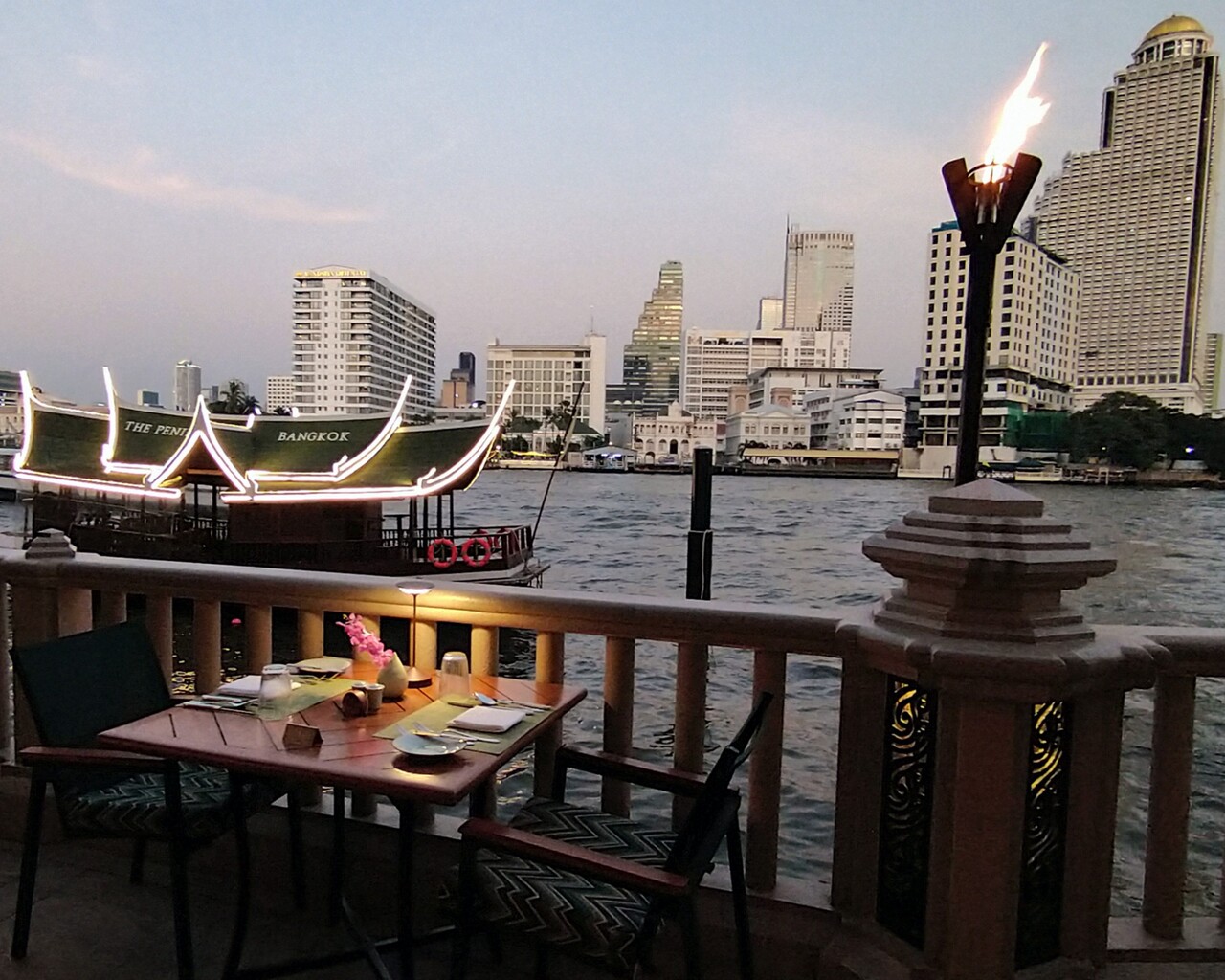 だんだんと日が暮れ、ライトアップされたクルーズ船が行き交うチャオプラヤー川を見ながら、ゆっくりと食事できます。