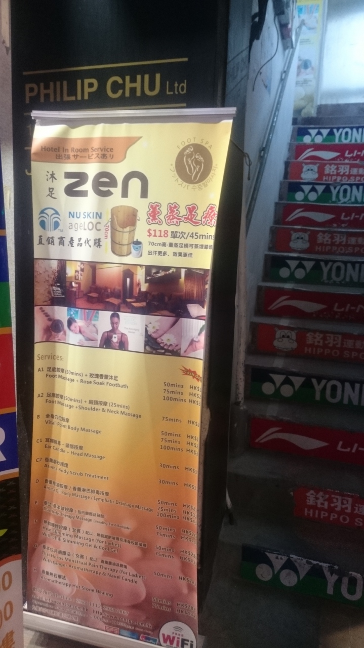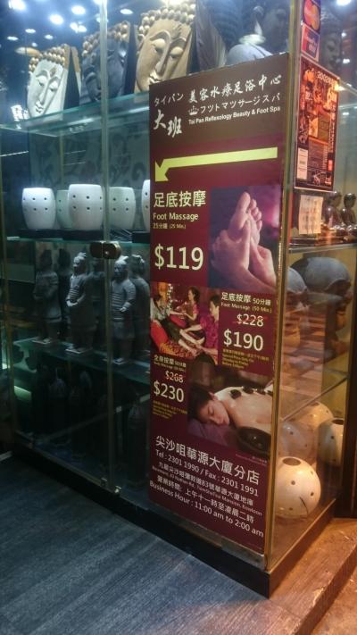 足25分と頭首肩25分をお願いして230HKD。足はタライに浸けるのではなく、バブルの出るフットバスタイプです。マッサージは、横になって受けます。とても気持ち良かったです。