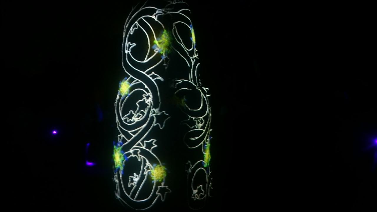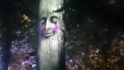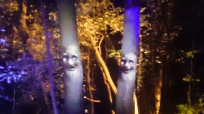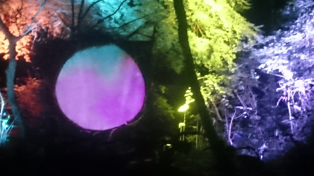 手塚治虫さんの「火の鳥」をテーマに、プロジェクトマッピングされた夜の森を、予約した時間ごとの人達がまとまって、1.2キロ歩きます。