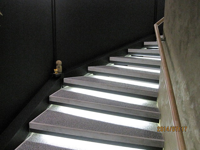 階段を登った入口に安置されている「制た迦童子」の横から照明された回廊を登ります。階段の壁面には、17文字の梵字が書かれています。これは「般若心経」の真言で、この階段を上ることで、般若心経を読誦したのと同じ功徳が得られるとのことです。