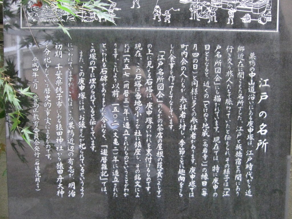 巣鴨の中山道沿いにある庚申塚は、江戸時代から近郷近在に聞こえた名所でした。江戸と板橋宿との間にあり、行き交う旅人で賑わっていたと伝えられ、その様子は「江戸名所図会」にも描かれています。現在では、特に庚申の日になると、近くの「とげぬき地蔵(高岩寺)の縁日(毎月四の日)と同様に多くの参拝者があります。庚申塚では町内会の人たちが、参拝者に対し、季節ごとに趣向をこらした食事を作ってもてなしています。・・・・・