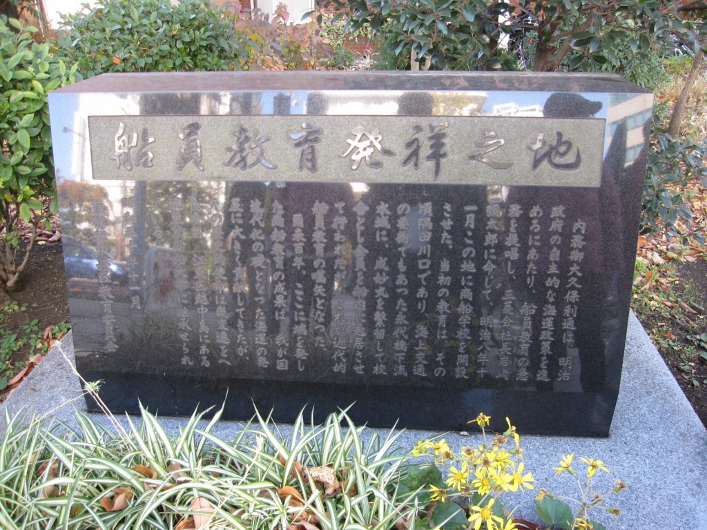 内務卿大久保利通が、明治政府の自主的な開運政策を進めるのあたり、船員教育の急務を提唱し、三菱会社社長岩崎弥太郎に命じて、明治8年11月この地に商船学校を開設させた。