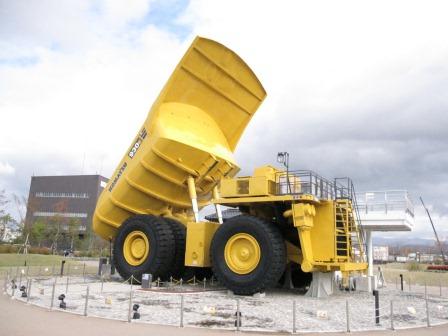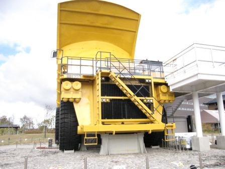 まず、駅からも見える超大型ダンプトラックが展示されています。このダンプのサイズは高さ7.32m、幅8.69m、高さ15.32m、タイヤの直径3.83m、最大積載量297トン、車体重量202トンあります。