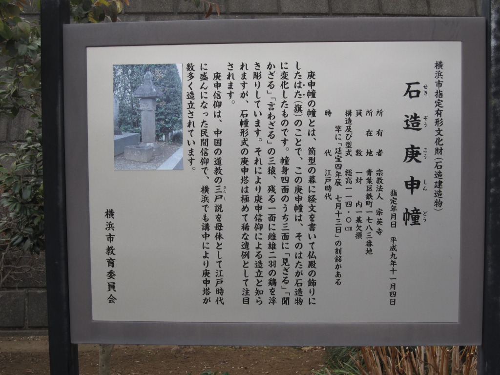 石造庚申幢は宗英寺にあり、「見ざる」「言わざる」「聞かざる」が彫られています。