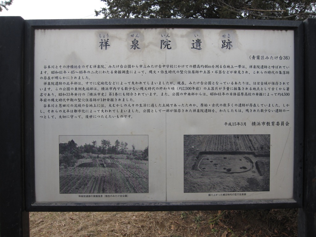 また、横浜市青葉区みたけ台公園からみたけ台中学校にかけての標高約46mの高台一帯は「祥泉院遺跡」と呼ばれています。