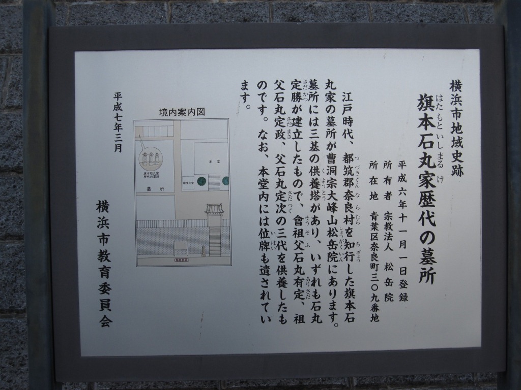 旗本石丸家歴代の墓所は、横浜市青葉区奈良2丁目の「松岳院」の墓地にあり、平成6年横浜市登録文化財地域史跡になっています。