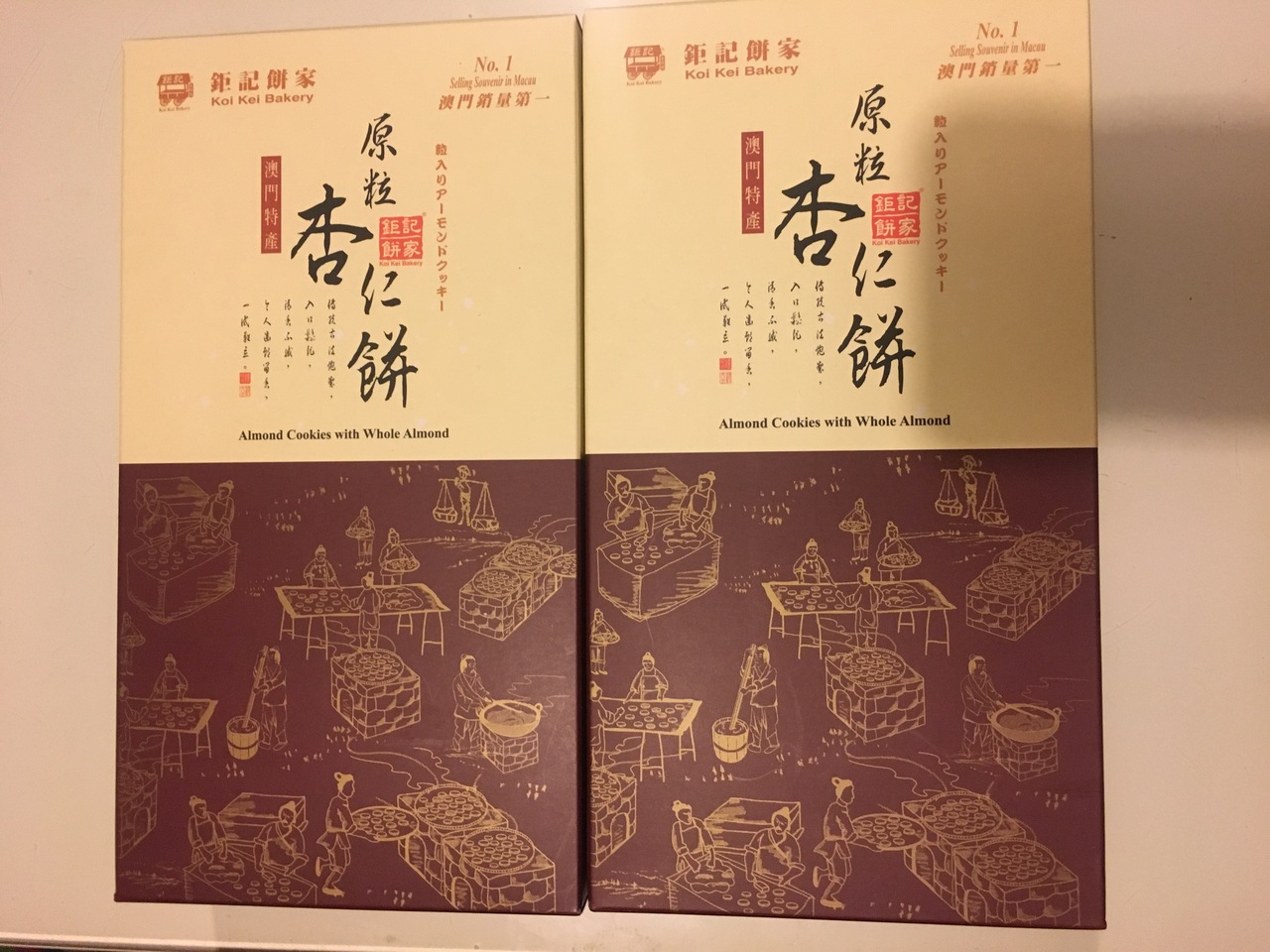 クレジットカードが使える事、試食も沢山置いてあり、味見して購入出来るので安心便利です。しかも比較的安価。6個入り杏仁餅が28MOP