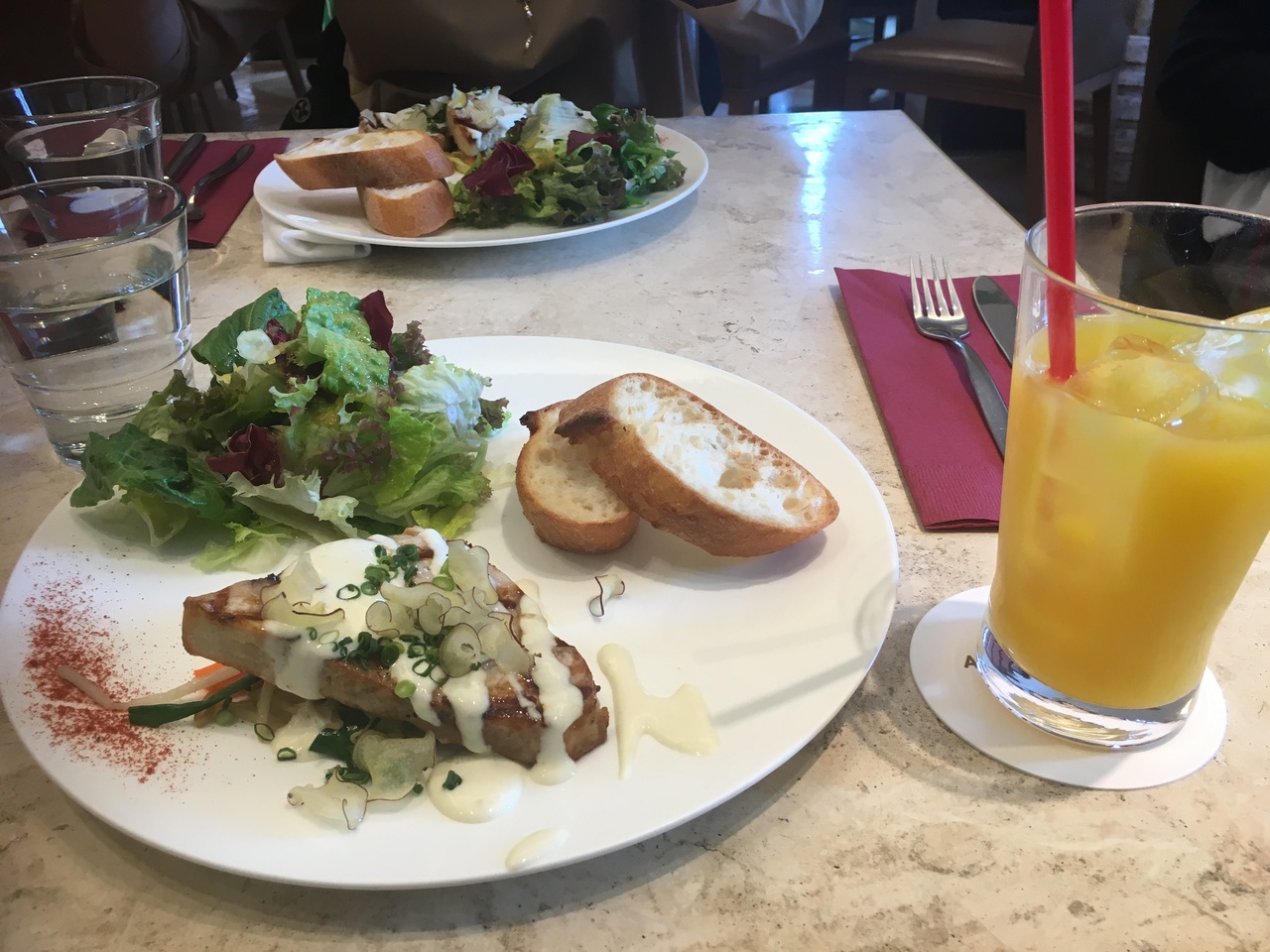 お魚のランチセットとオレンジジュースにしました。程よい量で見た目も綺麗、美味しかったです。次回はスイーツも食べたいな。- 旅行時期